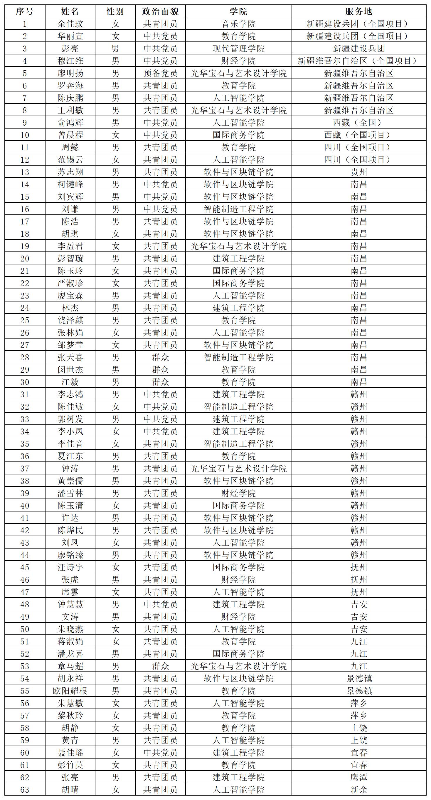 根据江西省项目办的相关要求,省项目办向我校派发了63个岗位名额,按照公平、公正、公开择优原则,我校进行了西部计划志愿者的招募与选拔工作,经公开招募、学生自愿报名、学院审核推荐,学校项目办组织笔试、面试等环节综合考察,拟推荐彭亮等63名同学为江西应用科技学院2023年西部计划志愿者候选人,现将名单及具体信息公示如下: