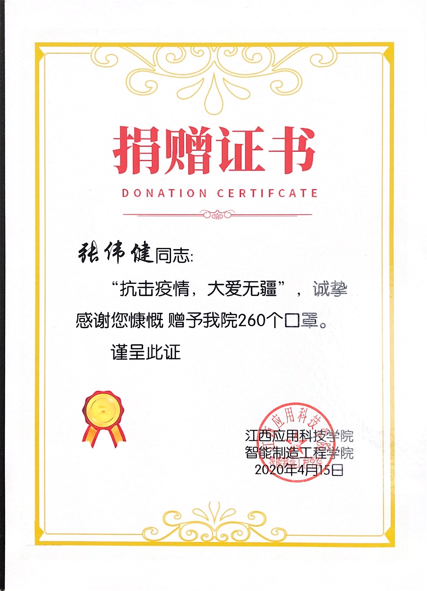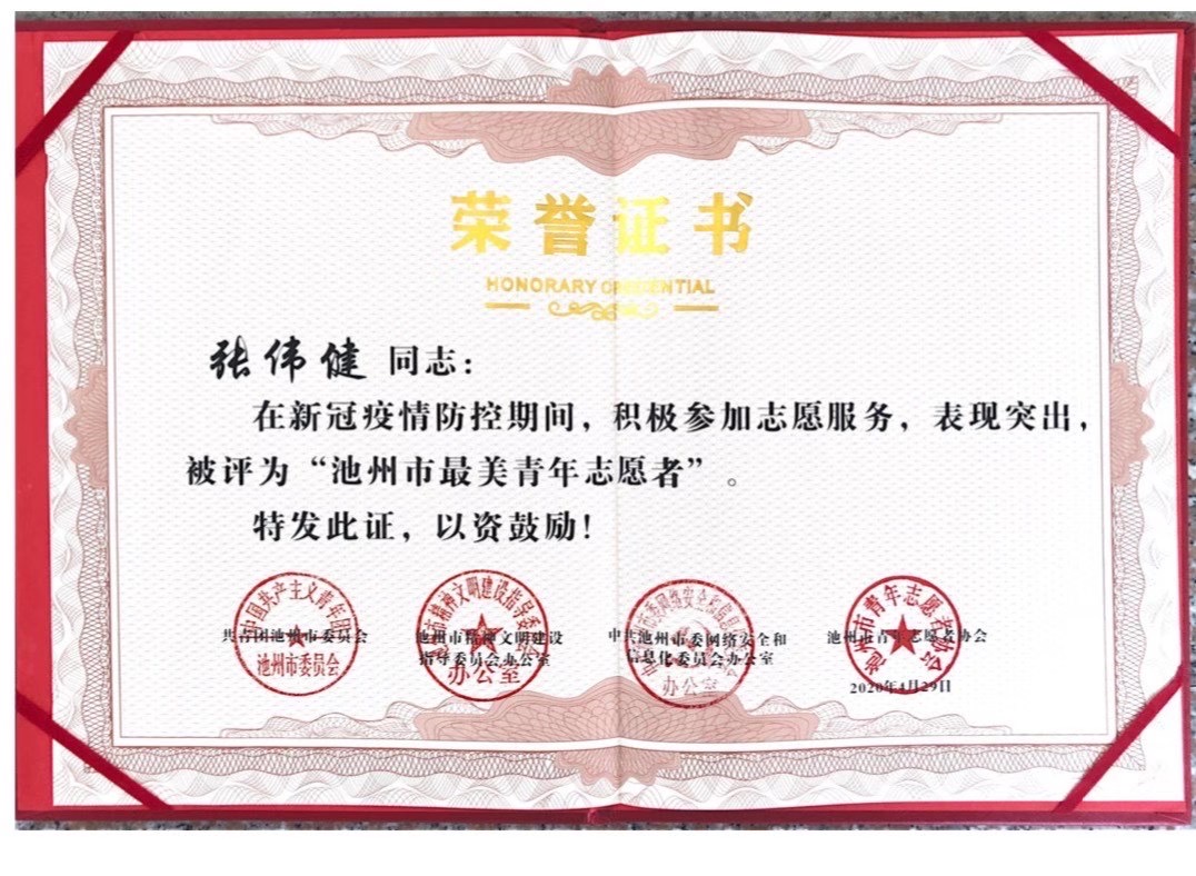 近日,共青团中央、中国青年志愿者协会授予295人“抗击新冠肺炎疫情青年志愿服务先进个人”称号;149个集体“抗击新冠肺炎疫情青年志愿服务先进集体”称号。江西省共11位先进个人获得表彰,其中我校智能制造工程学院张伟健老师被授予“抗击新冠肺炎疫情青年志愿服务先进个人”称号。