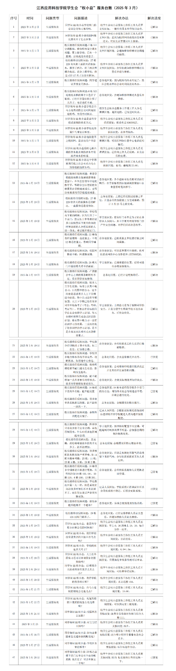 传心声,诠心意,全心全意权小益。江西应用科技学院学生会“权小益”始终坚持“全心全意为同学服务”的宗旨,牢记“想同学之所想,急同学之所急”的初心,“有问题,找小益”逐渐成为更多同学的权益共识。2025年三月份,权小益工作台账共计315件,已解决问题289件,持续跟进问题26件(其中主要为宿舍空调故障、漏水频发、校园路灯不亮、教室设备损坏等问题。)针对宿舍空调故障、漏水频发等问题,相关负责人表示会帮其在智慧应科上报修, 对于难以维修的也会积极在校长接待日反映。针对校园路灯不亮、教室设备损坏等问题,校领导回复会及时安排相关维修人员更换设备。