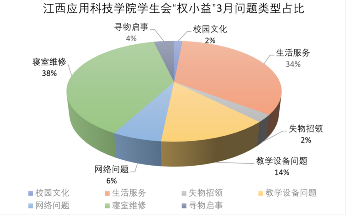 本月江西应用科技学院学生会“权小益”累计解决问题465件,其中生活服务方面157件,教学设备问题65件,网络问题29件,寝室维修方面179件,失物招领方面11件,寻物启事17件,校园文化方面7件。以下是本月权益问题的占比图。江西应用科技学院学生会将继续秉持“全心全意为同学服务”的宗旨,坚持从同学中来,到同学中去,为同学办实事,维护同学权益。今后,小益将继续充分发挥桥梁和纽带作用,用诚心倾听同学需求,以真情为同学服务!