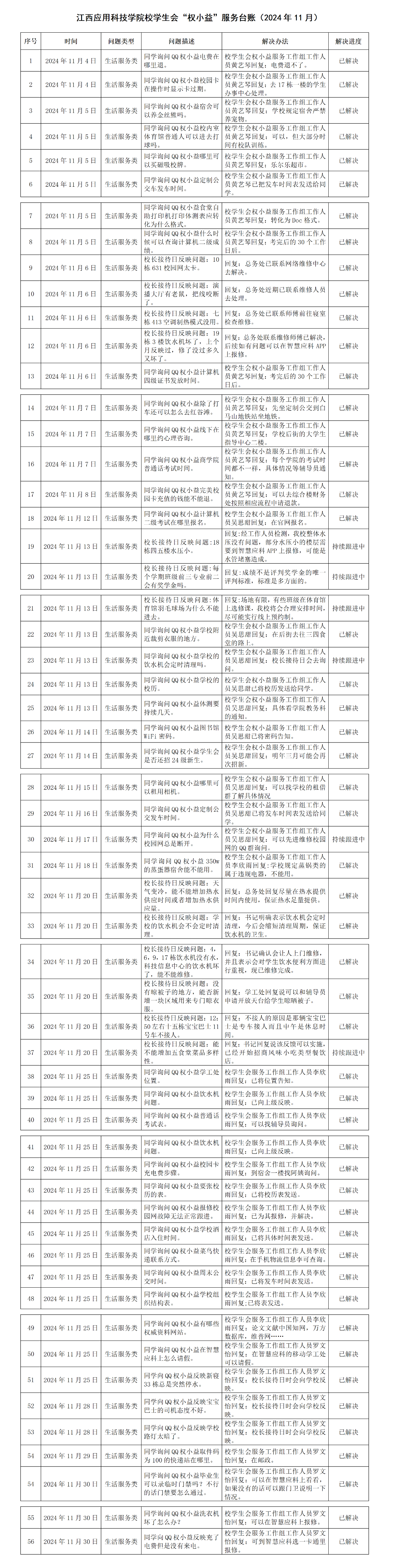 传心声,诠心意,全心全意权小益。江西应用科技学院学生会“权小益”始终坚持“全心全意为同学服务”的宗旨,牢记“想同学之所想,急同学之所急”的初心,“有问题,找小益”逐渐成为更多同学的权益共识。2024年11月份,权小益工作台账共计352件,已解决问题331件,持续跟进问题21件(其中主要为寝室楼道饮水机损坏或有异味、被褥晾晒不方便问题)。