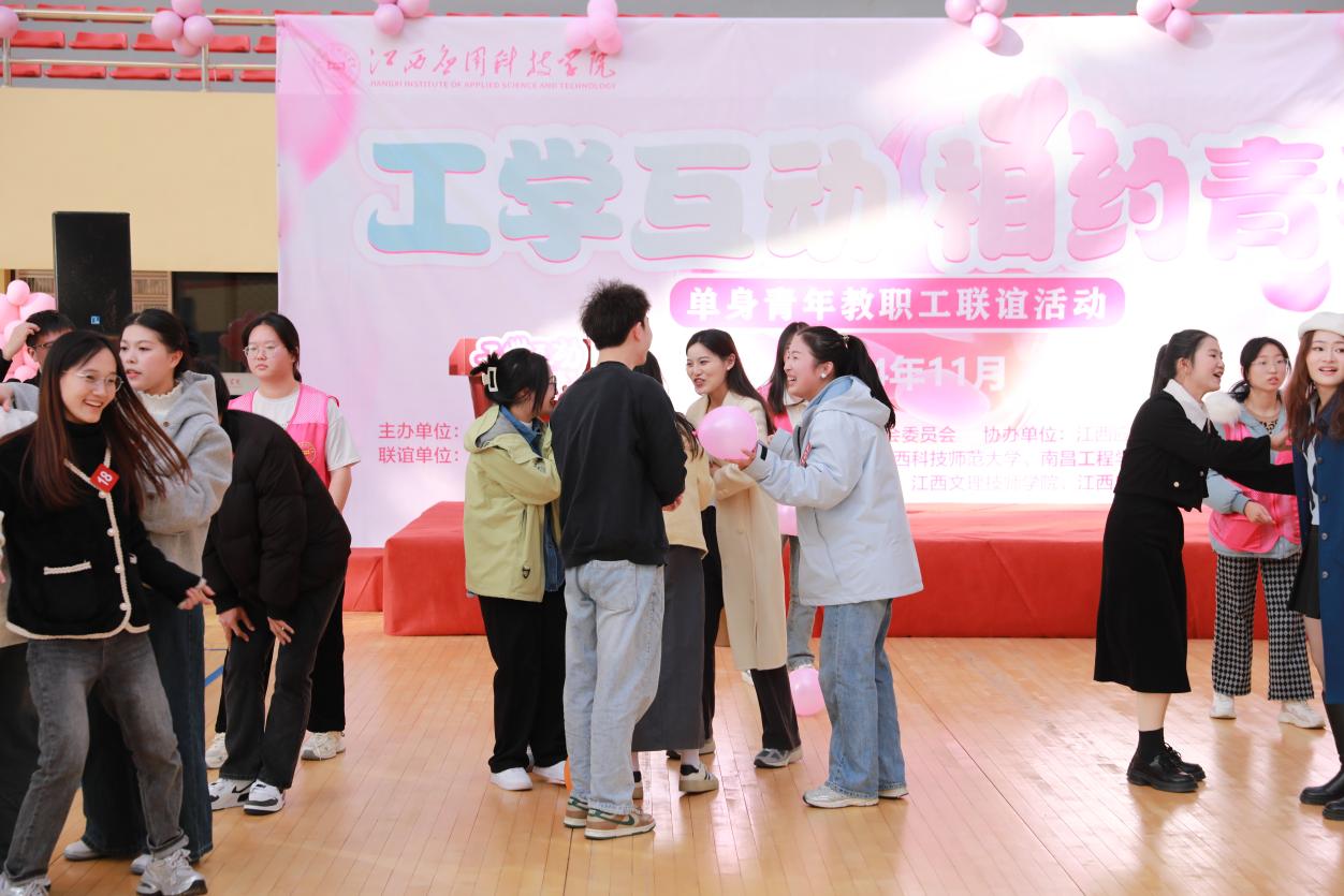 千里姻缘一线牵,佳偶天成应科院!11月30日,江西应用科技学院室内体育馆内洋溢着青春浪漫的气息,由江西省教育工会主办、江西应用科技学院工会承办的“工学互动 相约青春”第二区域第二场单身青年教职工联谊活动温情启幕。江西省教育工会主席宋懿非,江西应用科技学院党委书记、政府督导专员贺一松,江西省教育工会宣传保障部部长罗福云,江西应用科技学院校长助理、工会主席黄春梅,南昌应用技术师范学院工会副主席朱蕾,江西文理技师学院常务副校长曹园园出席活动。有来自南昌航空大学、江西农业大学、江西中医药大学、南昌工程学院、南昌大学附属口腔医院、新建区教体局等11家单位145名教职工报名参加,活动历时5小时。现场欢声笑语不断,气氛热烈而温馨。