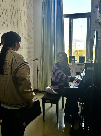 课上,沈格格老师进行练声训练,首先是打嘟,从简单的音阶、音程开始,紧接着用“a、e、i、o、u”等元音练习,让学生找到正确的发声位置和状态,逐渐扩展音域,提高声音的稳定性和灵活性。在歌曲演唱指导上,沈格格老师先示范演唱,学生逐句模仿,注意音准、节奏、发声方法及情感表达等细节。课后,沈格格老师与观摩教师就教学过程的设计、师生互动、课堂小组讨论、教学评价等几个方面进行了交流和沟通,推动教学创新。