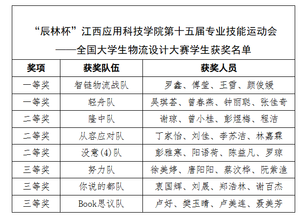 经过紧张激烈的角逐,根据汇报作品内容的完整度、针对性、创新性等指标,以及现场答辩的表现进行了综合评分。最终,智链物流战队和轻舟队凭借卓越的表现和出色的物流设计方案荣获一等奖;隆中队、从容应对队和没意(4)队获得二等奖;努力队、你说的都队和Book思议队荣获三等奖。