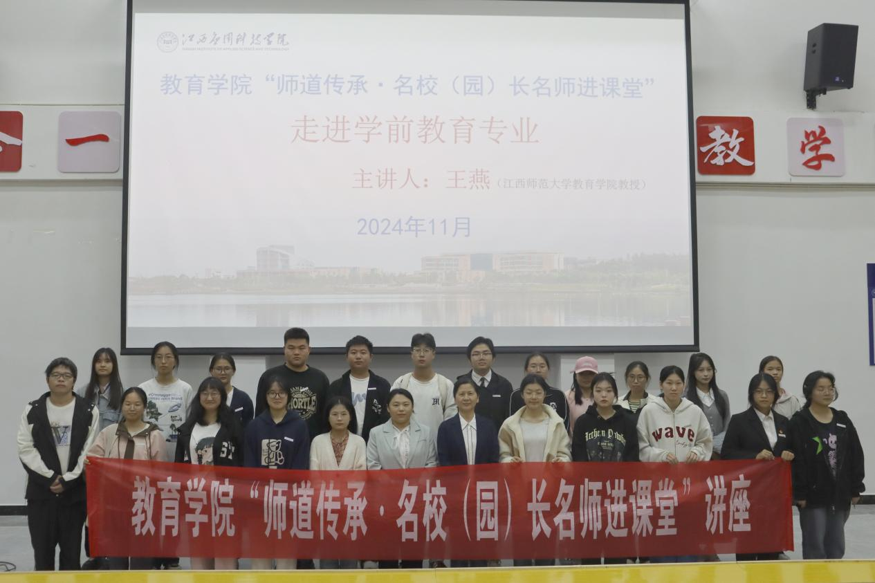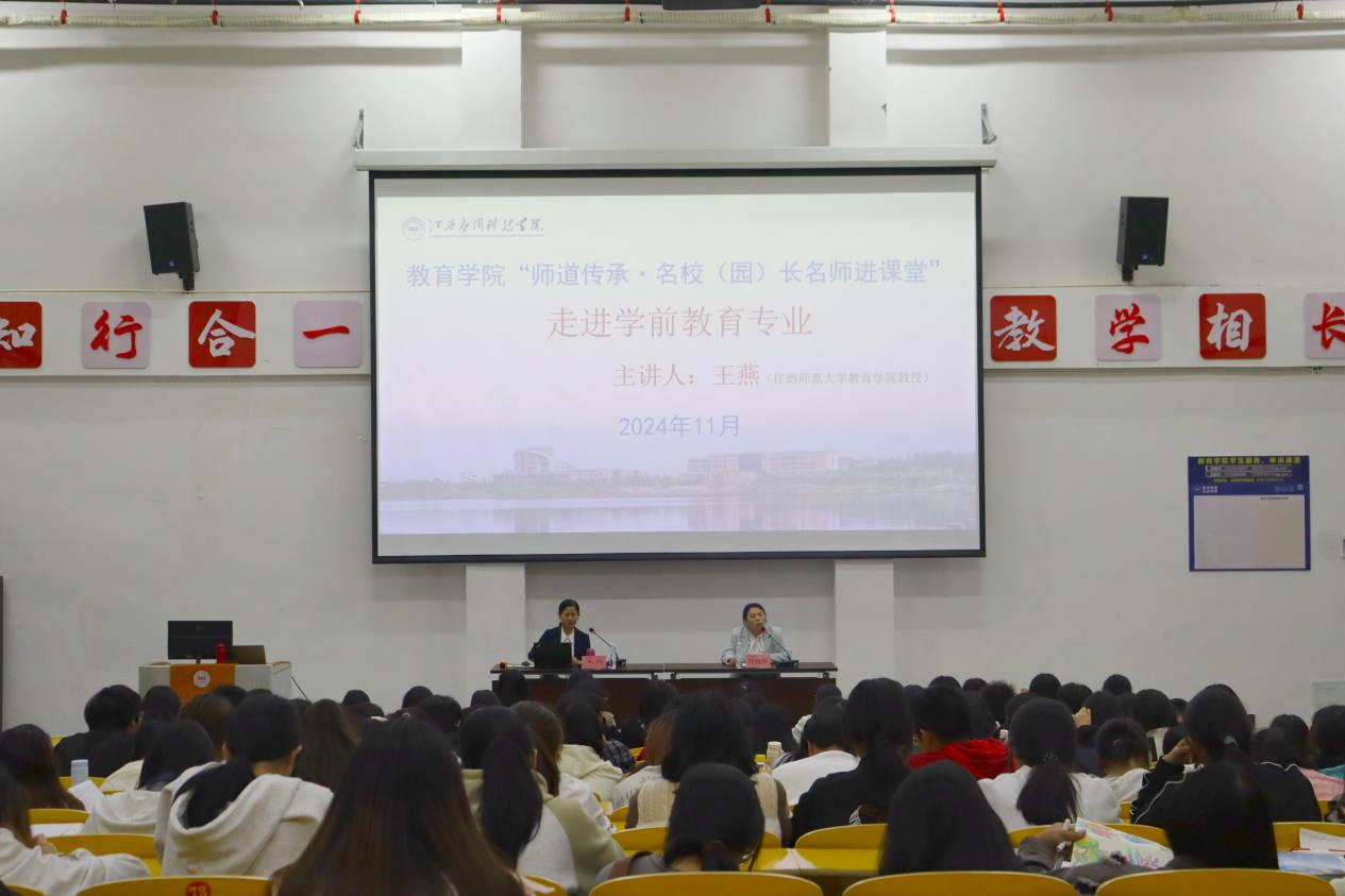 为进一步加强学院与区域基础教育的交流与沟通,加强师范生专业技能及职业素养,发挥区域基础教育领域名校(园)长、名师及其团队的教学引领与指导作用,强化学院师生对区域基础教育师资需求和课堂教学改革的清醒认识,加深学生对区域基础教育教师专业知识、专业技能和教育情怀的认识和理解,提升学生的责任意识和专业使命感,学院特举办第二十期“师道传承•名校(园)长名师进课堂”活动。11月12日,学院邀请江西师范大学学前教育研究中心副主任、江西省学前教育质量提升指导专家、江西省多家省级示范幼儿园顾问王燕教授在志远楼101报告厅为2023、2024级学前教育专业学生作了题为《走进学前教育专业》专题讲座,讲座由学院副院长刘晓领主持。