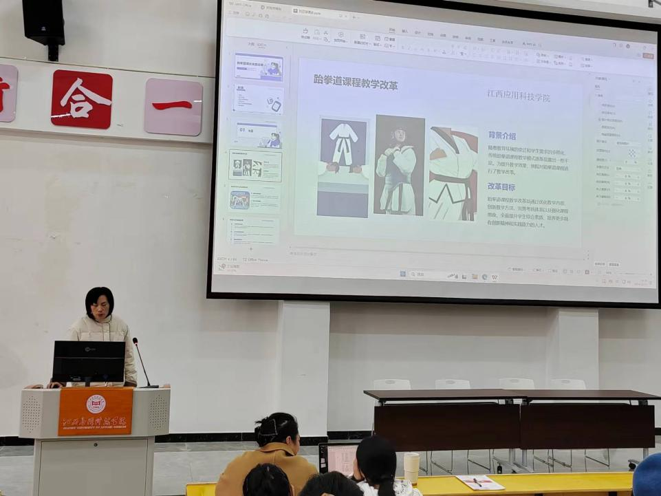 汇报中,学院第四批大规模课堂教学改革课程负责人就各自课程的教学改革实践进行了详细汇报,展示了教学改革的成果和经验。体育教育教研室的廖攀老师以“基于OBE理念《主项提高-足球》课程中的实践与探索”为主题,强调课堂教学改革的核心在于明确学生通过课程学习后应掌握的具体能力和水平,注重过程评价与结果评价的结合,并根据学生的个体差异进行评估。公共体育教研室刘正琼老师汇报了“跆拳道课改实践总结”,她从优化教学内容、创新教学方法、完善考核体系以及强化课程思政等方面进行了总结,旨在全面提升学