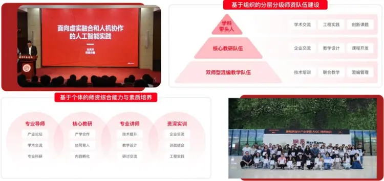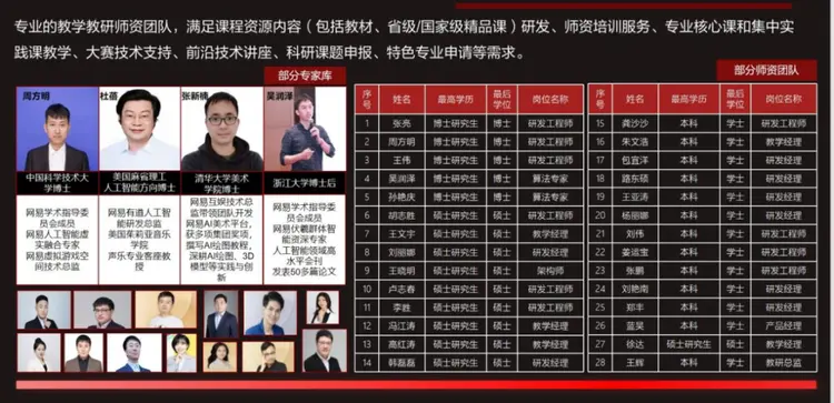 网易拥有专业的教学教研师资团队,满足课程资源内容(包括教材、省级/国家级精品课)研发、师资培训服务、专业核心课和集中实践课教学、大赛技术支持、前沿技术讲座、科研课题申报、特色专业申请等需求。在专业建设教学分工上,网易派遣的企业讲师负责部分专业核心课、实训课、职业素养课等课程授课。