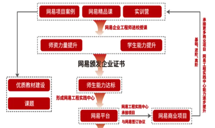 与网易进行合作,引入真实的业务场景,采取实训项目合作制,网易技术工程师带领学生完成对应项目实践培训,并针对学生能力进行审核,审核通过后会由网易通过数字资产交易平台分配有一定金额的真实任务,由学校带队老师带领学生完成相应项目研发并实现项目收益,在此过程中大大提高了学生解决实际问题的技能和能力。