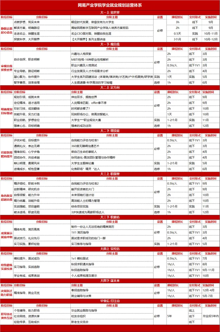探索未来,从此刻启航——教育不仅仅是学术知识的灌输,更是一场精心策划的职业生涯之旅。以下为不同阶段的学生量身定制的学业就业运营内容,旨在引领学生站在世界之巅、洞察自我、明确方向、增长技能、塑造职业形象,并在毕业后继续助力学生的成长。