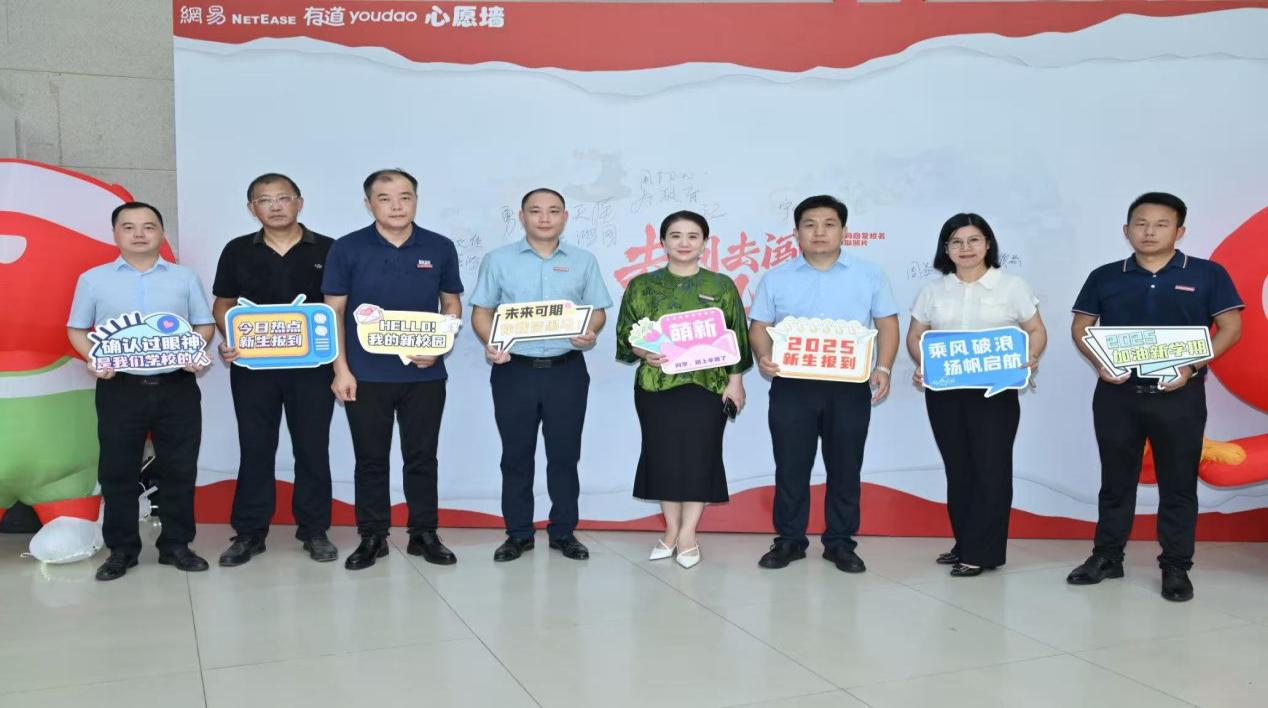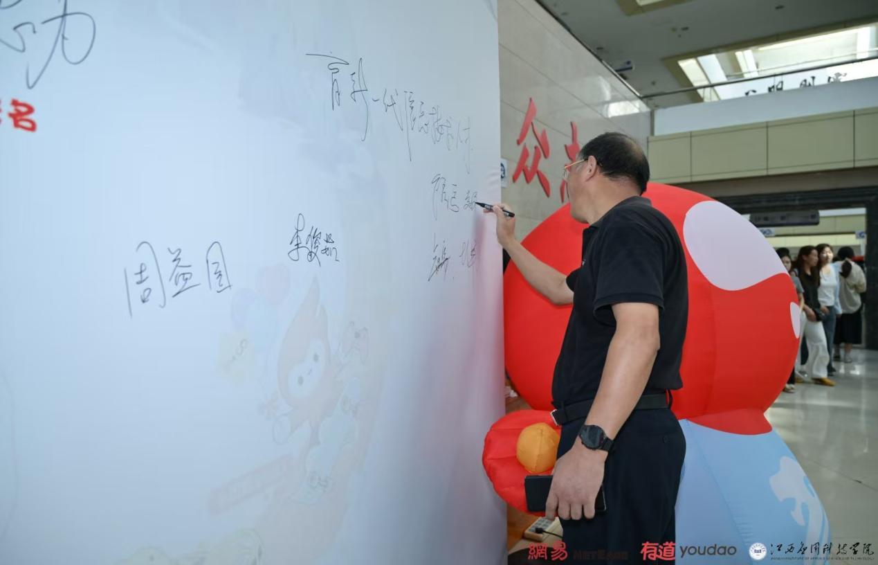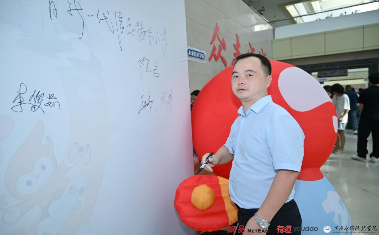 亲临网易有道人工智能产业学院迎新现场的领导有:江西应用科技学院党委委员、常务副校长干甜,江西应用科技学院党委委员、副校长谢远健,江西应用科技学院党委委员、副校长刘宇中,未来技术学院院长卞秀运,党总支书记卢胜勇,副院长赵应丁,副院长彭军等。学校领导、企业嘉宾也来心愿墙前打卡,写下对2025级学生满满的祝福。并在心愿墙合影留念,记录下自己在江西应用网易人工智能产业学院的初次“邂逅”。