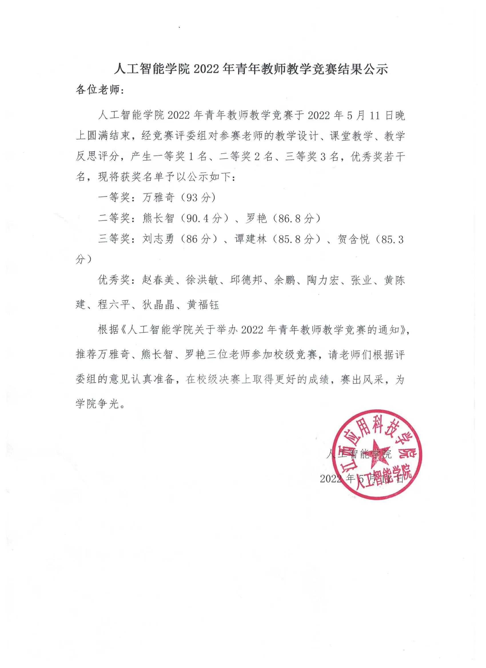 根据《人工智能学院关于举办2022年青年教师教学竞赛的通知》,推荐万雅奇、熊长智、罗艳三位老师参加校级竞赛,请老师们根据评委组的意见认真准备,在校级决赛上取得更好的成绩,赛出风采,为学院争光。