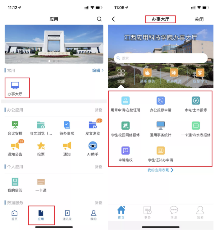 1.在APP底部“应用”栏目找到办事大厅,点击“办事大厅”小程序进去即可看到报修功能。随后按表中内容填入相应信息,提交即可。如图: