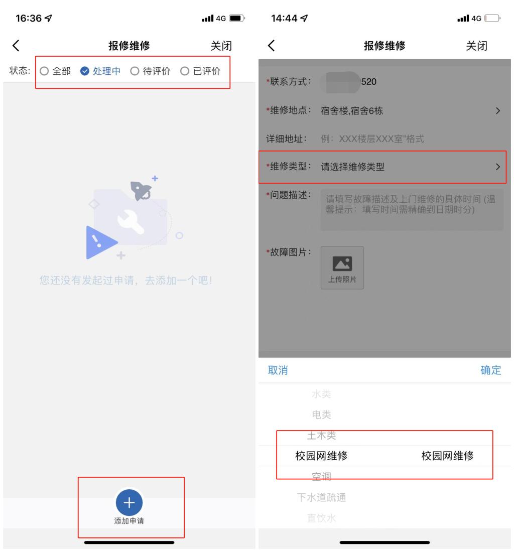 2.在“维修类型”选择“校园网维修”。