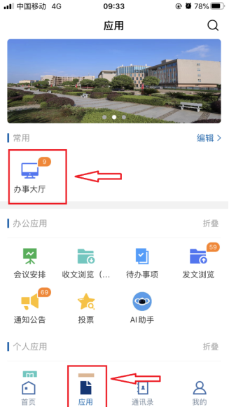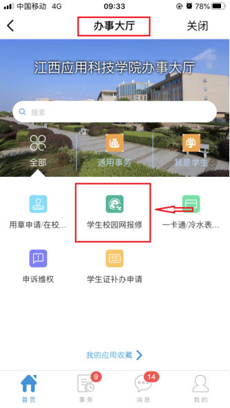 1.在“应用”栏目找到办事大厅,点击进去可看到学生校园网报修小程序。随后按表中内容填入相应信息,提交即可。