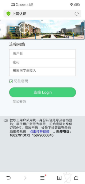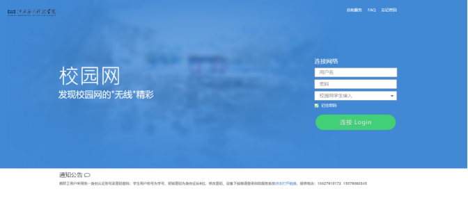 备注:用户名为个人学号,密码上网密码,如密码未曾修改,默认为身份证后6位,如忘记密码或需修改密码,请联系学校网络运维中心:83659900