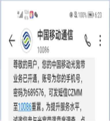 四、终端打开浏览器认证时输入页面如下,第一行用户名为学号;第二行密码默认身份证后6位;第三行运行商账号为:宽带手机号@lan(例如:18879010086@lan)、图1 所示范;第四行密码为宽带密码(在手机短信里面,如图二)选择中国移动接入,点击连接即可。