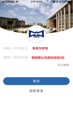 2.手机桌面中到江西应用科技学院APP,双击即可进入移动校园登录页面,输入学号和密码完成登录。(温馨提示:首次登入后请及时修改默认密码。咨询电话:83659900)