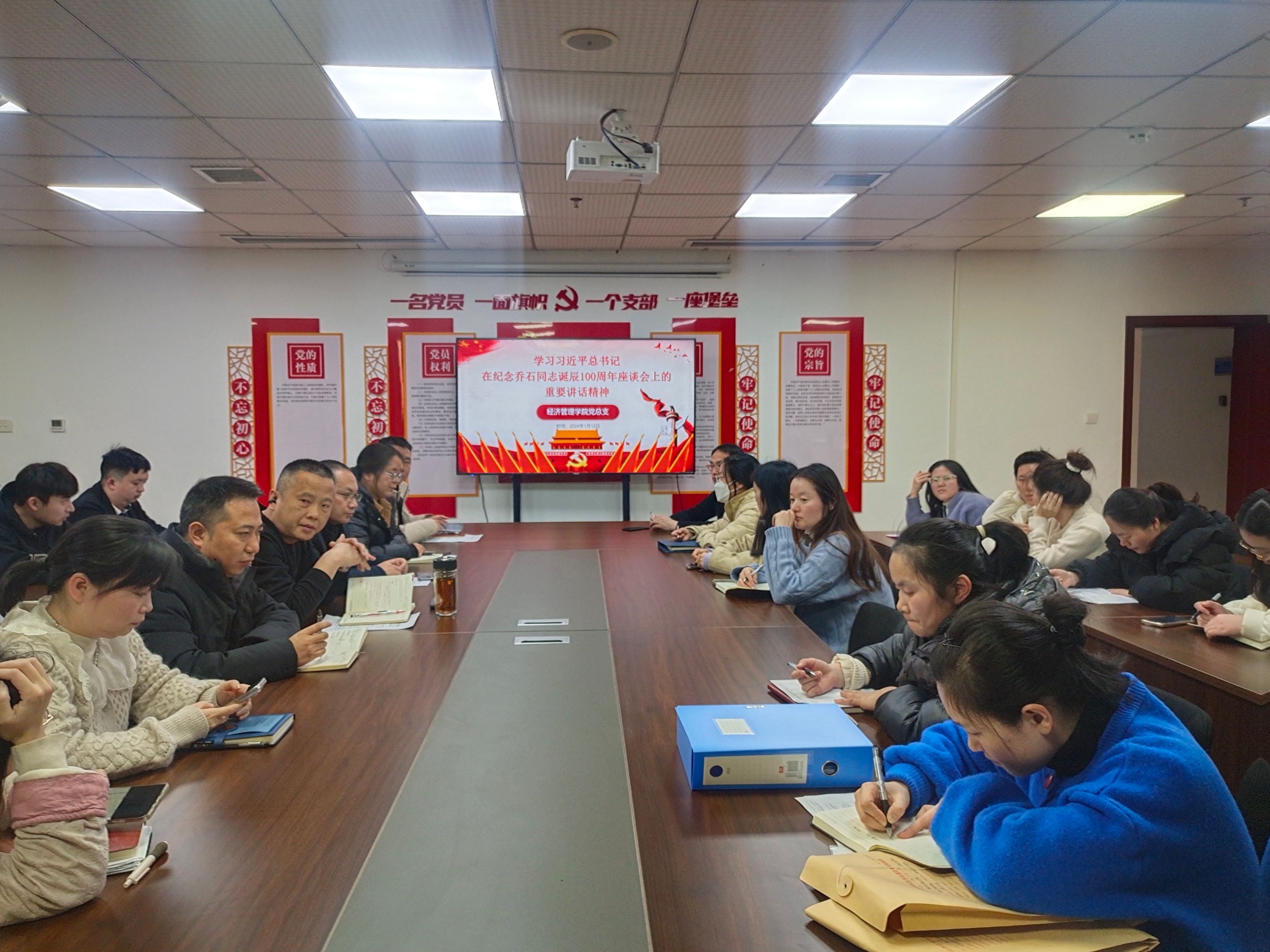 2025年1月12日,经济管理学院于综合楼305党员活动室开展了第一次党总支理论学习中心组学习(扩大)会议,传达学习习近平总书记在纪念乔石同志100周年诞辰座谈会上的重要讲话精神。会议由经济管理学院党总支书记王飞主持,全体中心组成员及党务干部参加学习会。