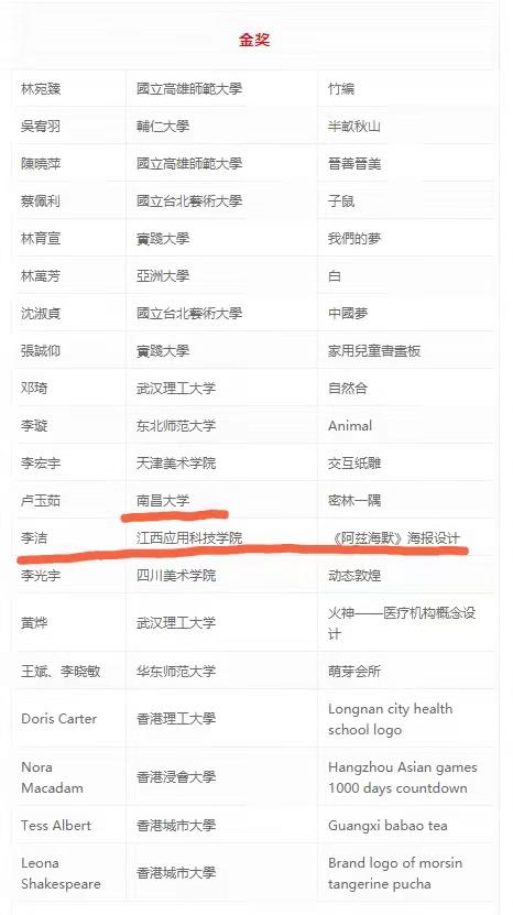 艺术设计学院师生再次斩获国际设计大奖。第二届国际大学生艺术年度奖评选结果新鲜出炉,艺术设计学院师生经过不懈努力和认真备战,最终取得了优异成绩,为学校赢得了竞赛荣誉。荣获金、银、铜奖共计42项,其中教师组金奖1项(江西省南昌大学1项,同类院校唯一);学生组金奖1项、银奖12项、铜奖28项。此次赛事主要面对区域为中国台湾地区、中国大陆地区、香港澳门地区以及新加坡地区的一项国际性设计大赛。此次大赛参赛选手个人组共计1770名,3679件作品;团体组共计66个院校组织参赛。经过评审,此次赛事共计822件作品获奖,其中金奖作品8件(4件优秀作品),银奖作品66件(12件优秀作品),铜奖作品112件。