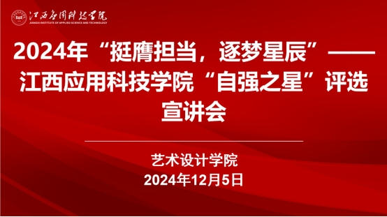 为深入贯彻落实《学工(部)处〔2024〕44号关于组织开展2024年“挺膺担当,逐梦星辰”——江西应用科技学院“自强之星”评选活动的通知》文件精神,12月5日,艺术设计学院党总支书记殷南琰于劲松楼202党员活动室开展了2024年“挺膺担当,逐梦星辰”——江西应用科技学院“自强之星”评选活动宣讲会。学院党总支书记殷南琰、学工科副科长江政建及全体辅导员参加本次会议。