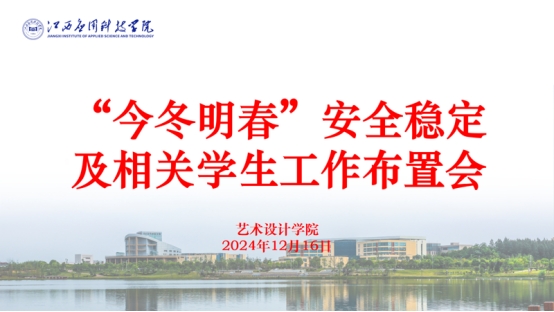 为进一步夯实安全稳定工作,营造学校、学院良好氛围,维护好和谐稳定的教育教学环境,艺术设计学院于2024年12月16日在劲松楼202党员活动室召开了“今冬明春”安全稳定及相关学生工作布置会,学院党总支书记殷南琰、学工科副科长江政建及全体辅导员参加。