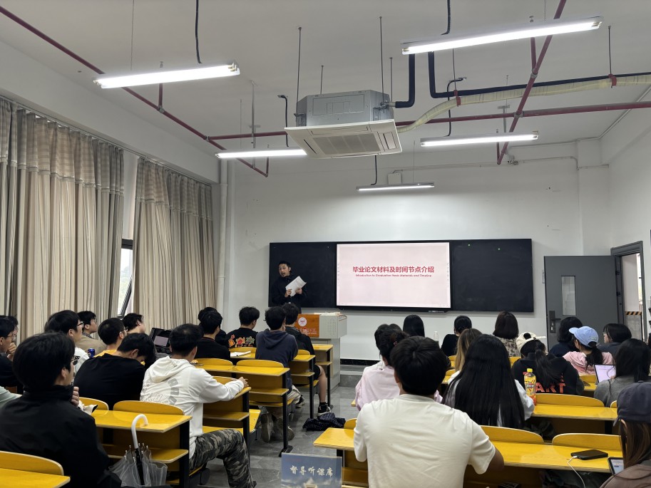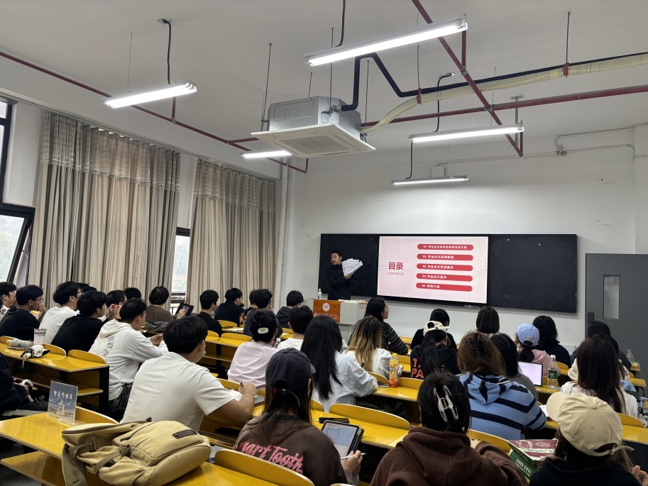 宣讲会首先明确了毕业论文工作的重要时间节点。根据学院安排,十月底将进行毕业论文的开题答辩,要求同学们在此之前完成选题、资料收集及开题报告的撰写。答辩前学生需进行题目提交,并准备PPT进行陈述等工作。此外,会议还提醒同学们注意后续的设计制作、中期检查及最终答辩的时间安排,确保整个毕业设计过程有条不紊地进行。