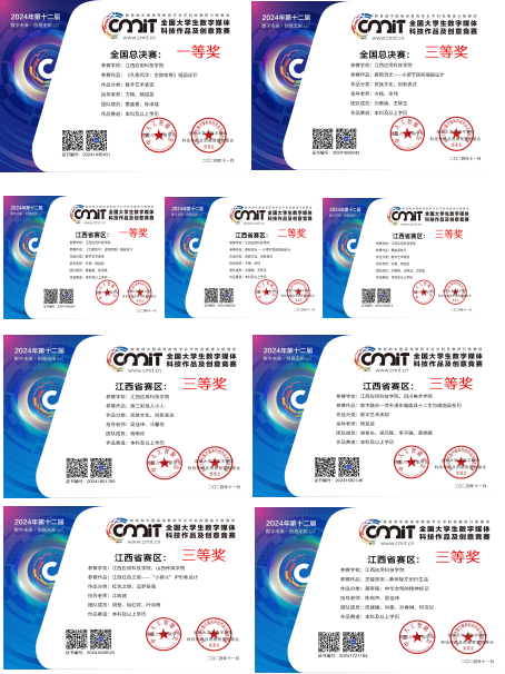 在2024年全国大学生数字媒体科技作品及创意竞赛的舞台上,江西应用科技学院艺术设计学院的师生们绽放出了耀眼的光芒。在本次竞赛中,我院师生凭借着卓越的创意与精湛的技艺,一路过关斩将,最终荣获省奖7项(省级一等奖1项、省级二等奖1项、省级三等奖5项),国奖2项(国家一等奖和国家三等奖)的优异成绩,为学院争得了荣誉,也为数字媒体领域注入了新的活力与创意。