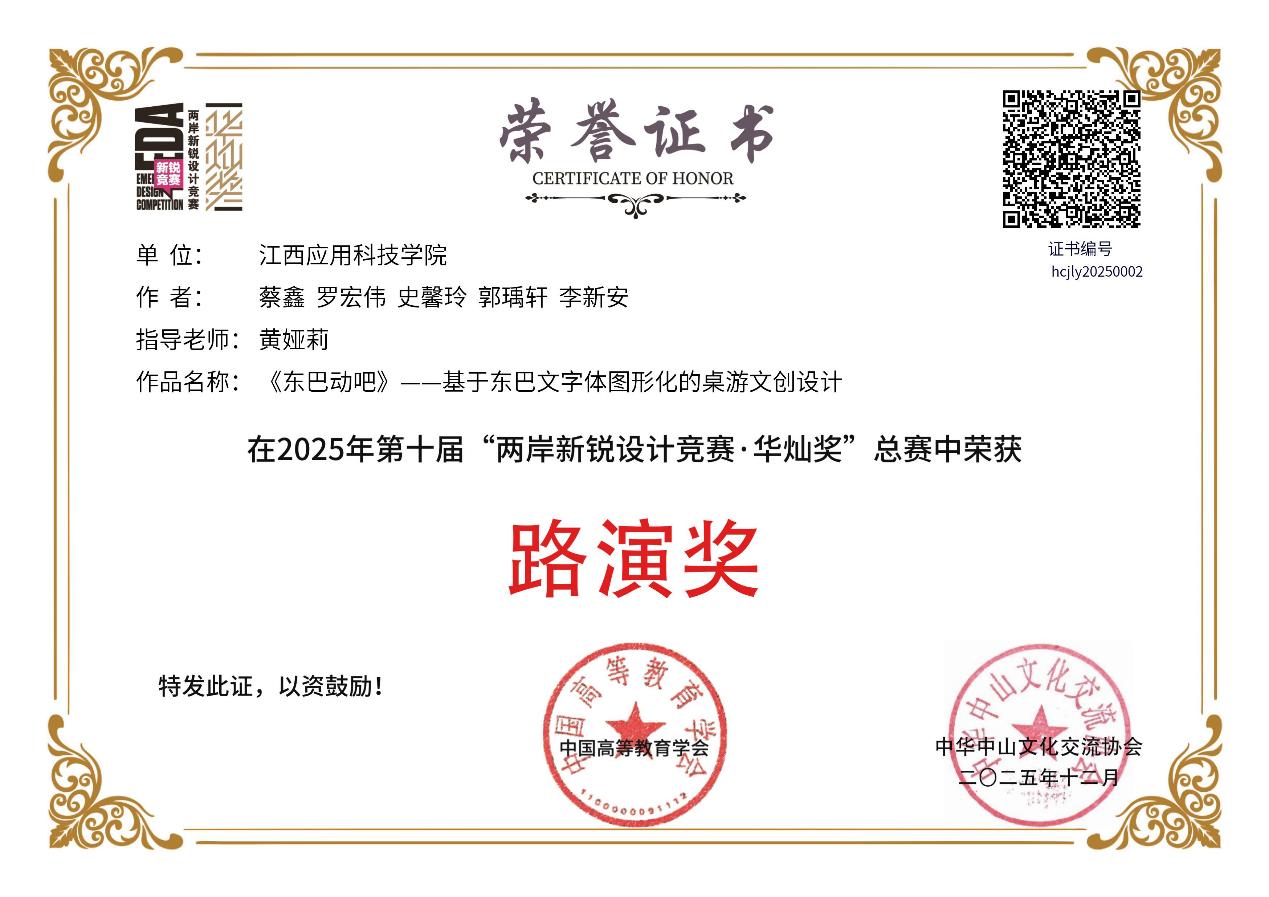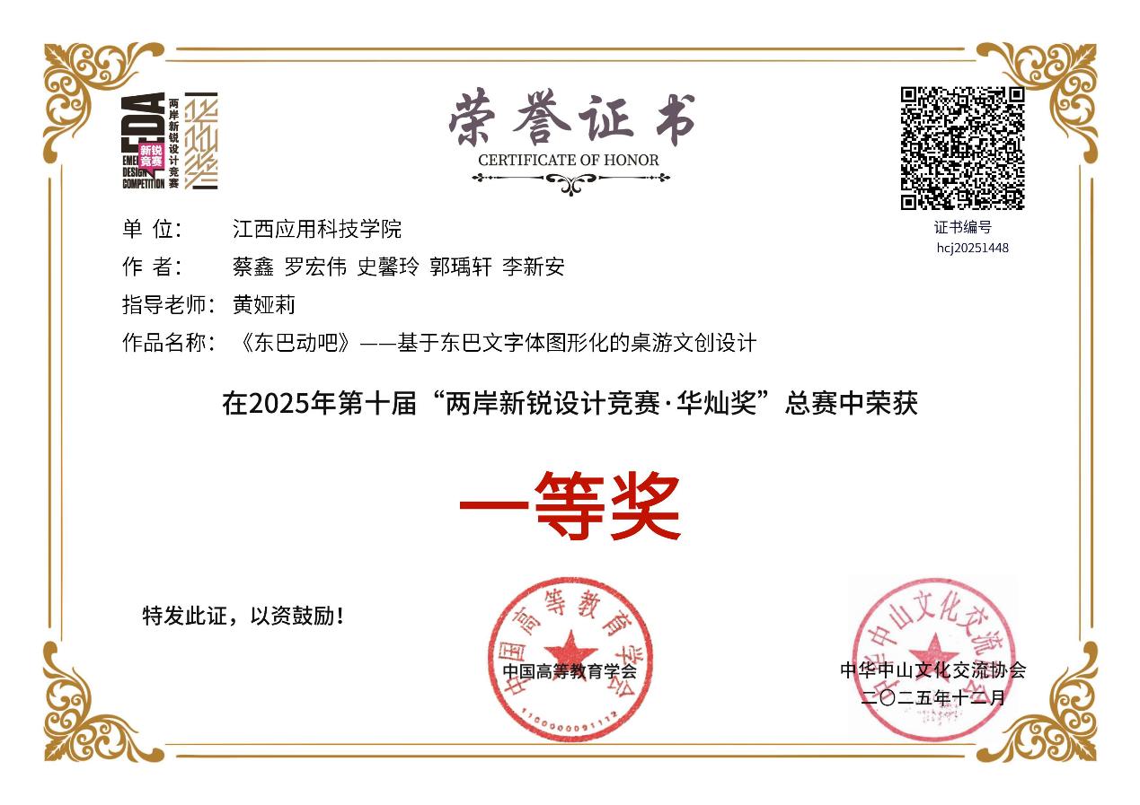 12月10日至12日,第十届“两岸新锐设计竞赛·华灿奖”颁奖活动在江苏苏州昆山市和无锡市举办。江西应用科技学院艺术设计学院在本届比赛中表现优异,共斩获多项荣誉,其中由黄娅莉老师指导,蔡鑫、罗宏伟、史馨玲、郭瑀轩、李新安五位同学共同完成的作品《东巴动吧——基于东巴文字体图形化的桌游文创设计》,荣获中华传统文化IP开发设计高校学生组全国一等奖,充分展现了学院在文化创意设计与传统文化传承创新方面的扎实功底与前瞻视野。