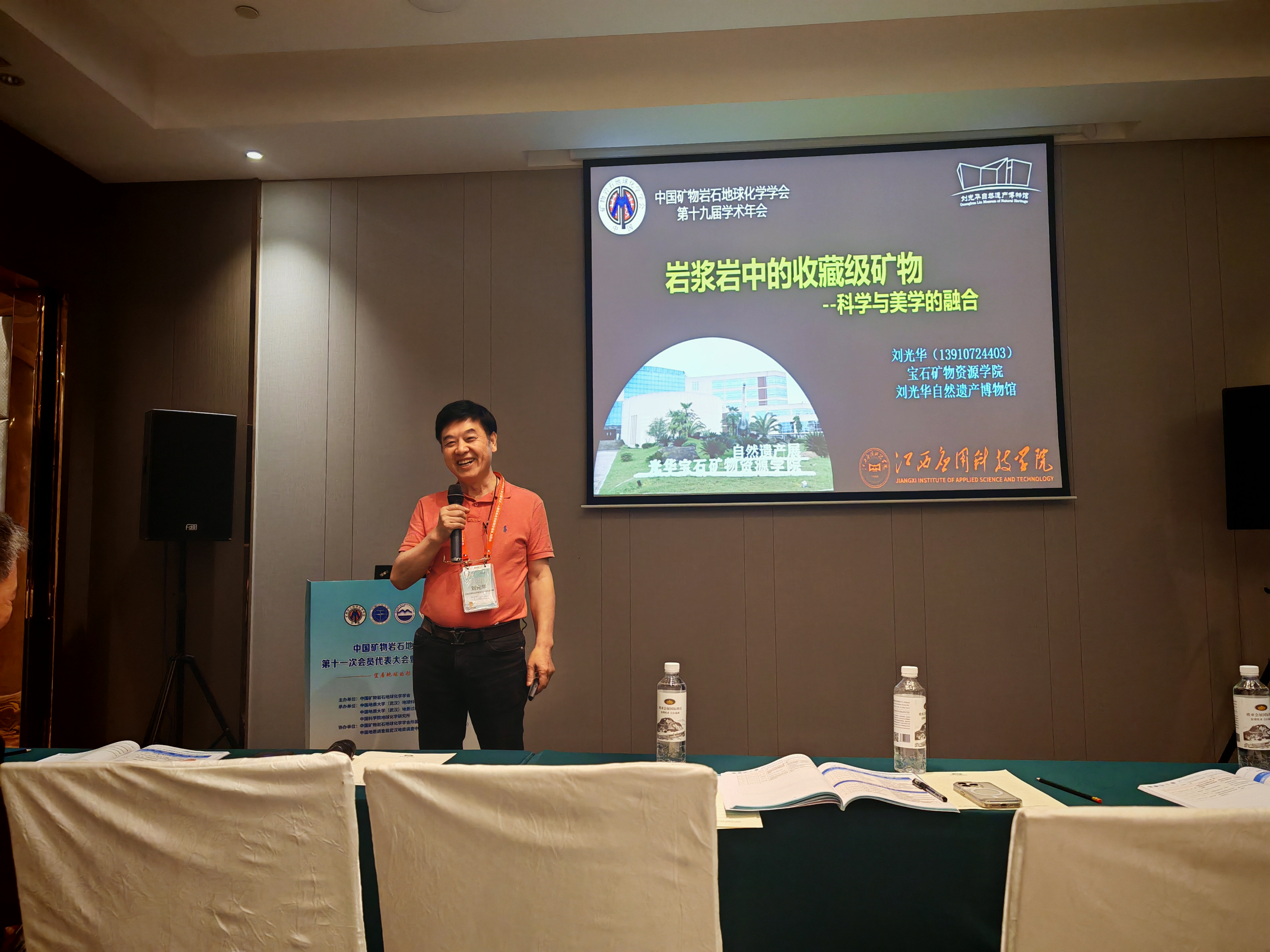 刘光华教授以“岩浆岩中的收藏及矿物——科学与美学的融合”为题,在火山-岩浆的通道系统及其能源环境效应分会场作特邀报告。从岩浆岩中收藏级矿物晶体形成条件引入,系统介绍从世界-亚洲最终聚焦中国的侵入岩及喷出岩中优质矿物藏品及其重要产地,并为在座专家学者分享了自身矿物藏品。最后刘光华教授表达对地质行业美好愿景:“希望通过我们的努力使中国地学教育、研究和科普工作做得更好,赶超国际先进水平;让中国特有的矿物、化石资源得到充分的保护,不再大规模的流出国门,为我们的子孙后代留下这些珍贵的自然遗产”。