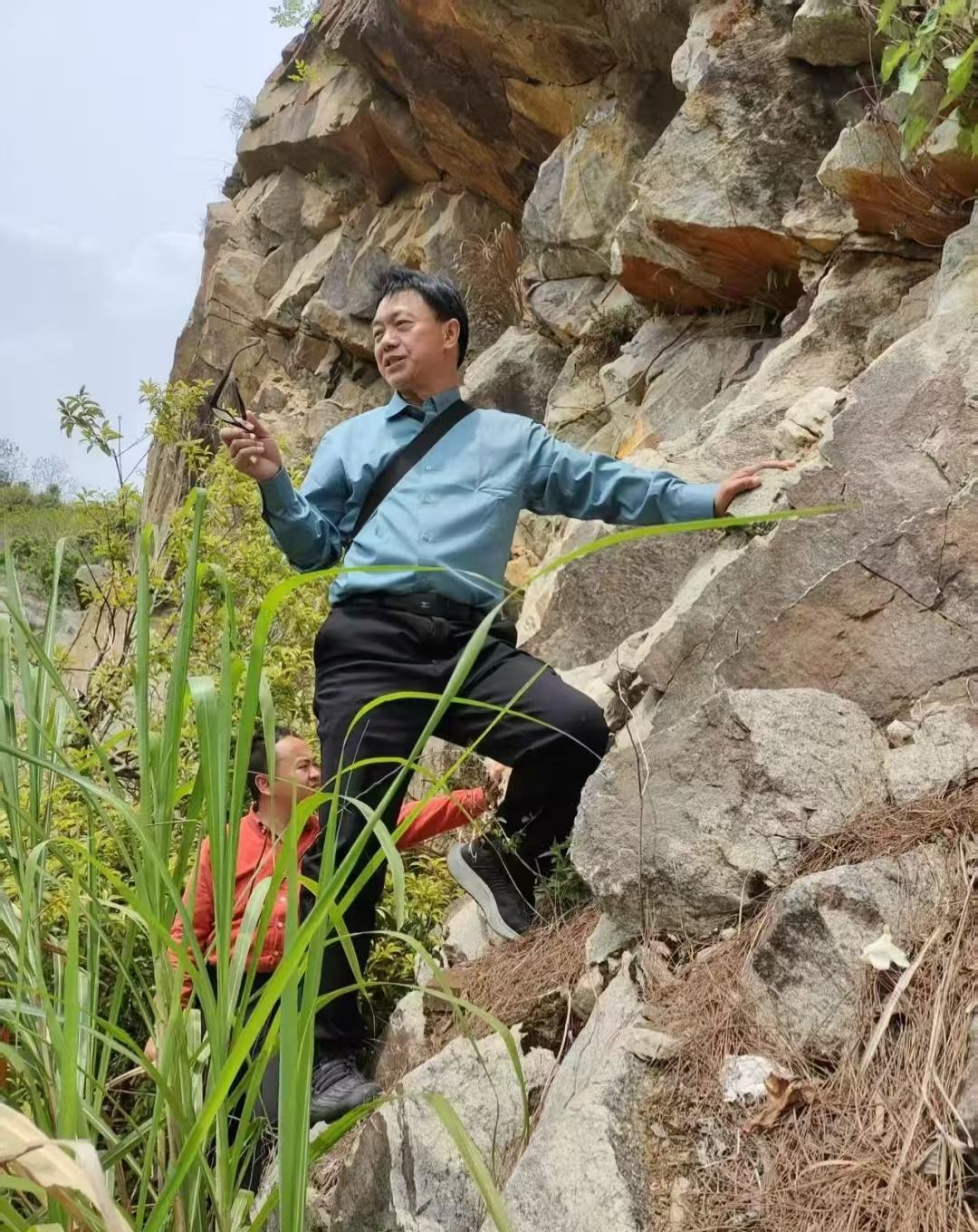 马教授结合区域地质情况,对老师们采集的岩石标本进行现场粗略的定名,指导老师们对石英、云母、长石等矿物进行野外识别。至于准确的定名,需要后续将采集的岩石标本进行切片后进行显微镜下观察。