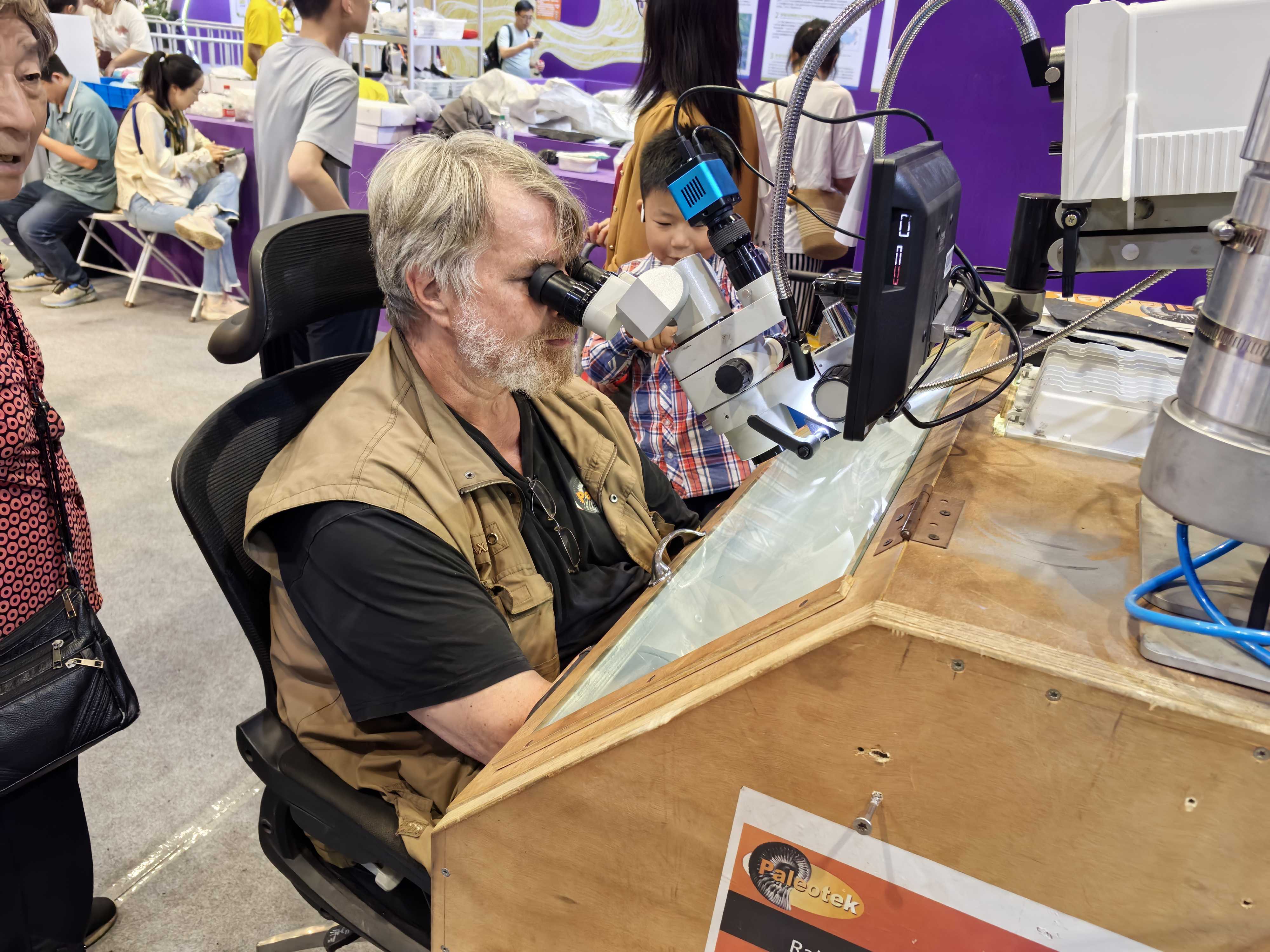 此外,教师们还参观了展览中设置的科普互动区域,体验了化石修复和陨石找寻等科普活动。这些新颖的科普教学方式为教师们打开了教学新思路,未来可以将这些先进的技术引入课堂和研学活动当中,丰富教学形式,提高学生的学习兴趣和参与度。我院特邀兼职化石修复高级技师Ralf Walter先生在中国南京(国际)矿物宝石化石博览会上通过现场演示化石修复技艺,吸引了大量专业观众及爱好者驻足观摩,有效推动了古生物修复技术的科普传播。