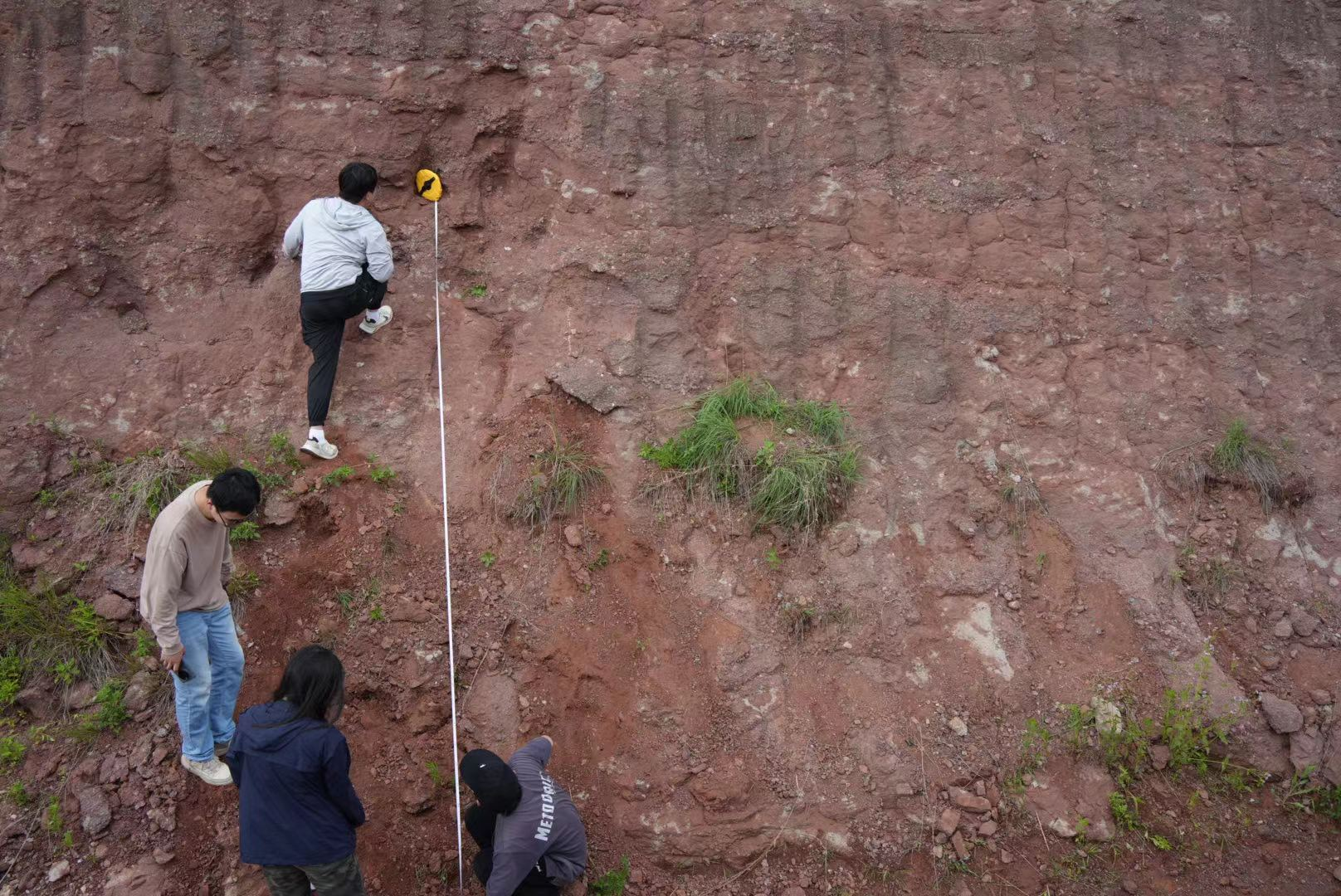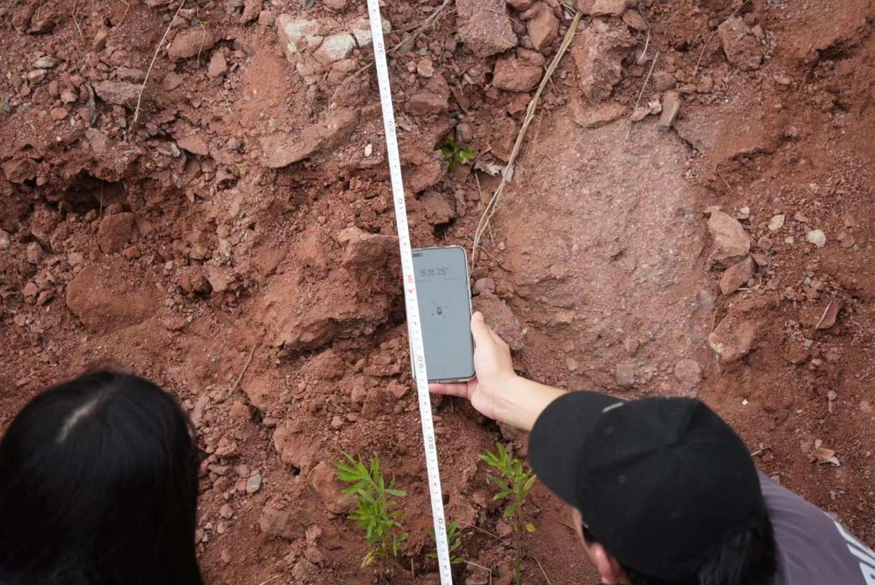 年轻老师们在刘光华院长的带领下实测了含恐龙蛋化石的沉积剖面并现场采样。