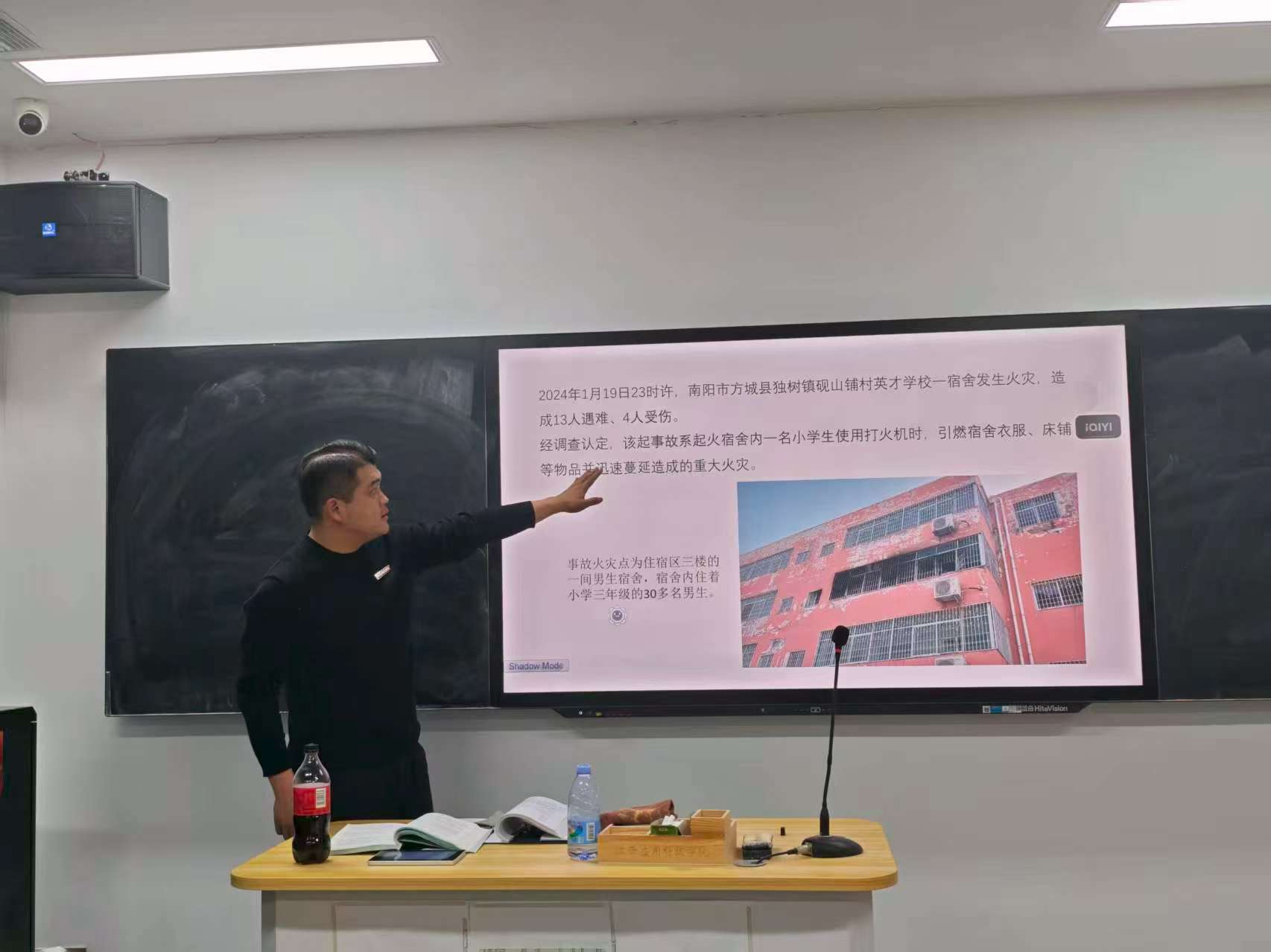 演习前,辅导员王宇航老师结合近年的典型火灾案例,分析火灾成因及初期处置要点,强调“小火快跑,大火关门”的基本原则。并针对高层建筑特点,详解安全出口识别、逃生路线规划及烟气躲避方法,提醒师生切勿乘坐电梯。讲解过程中,王宇航老师通过案例视频、互动问答加深理解,为后续实操奠定理论基础。