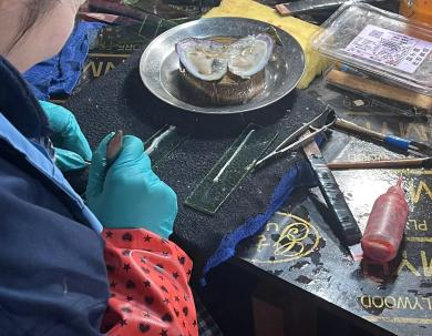 调研以淡水珍珠养殖关键技术为切入点,重点关注珍珠贝选育、插核培育、水质调控与生长周期等核心环节对珠层结构、光泽形成与品质稳定性的影响。教师团队从有机宝石教学视角出发,对不同生长阶段珍珠的形态特征、表面结构与光泽变化规律进行了针对性观察与记录,为后续在《有机宝石学》等课程中引入“真实材料—真实场景—真实问题”的教学案例提供了基础素材。