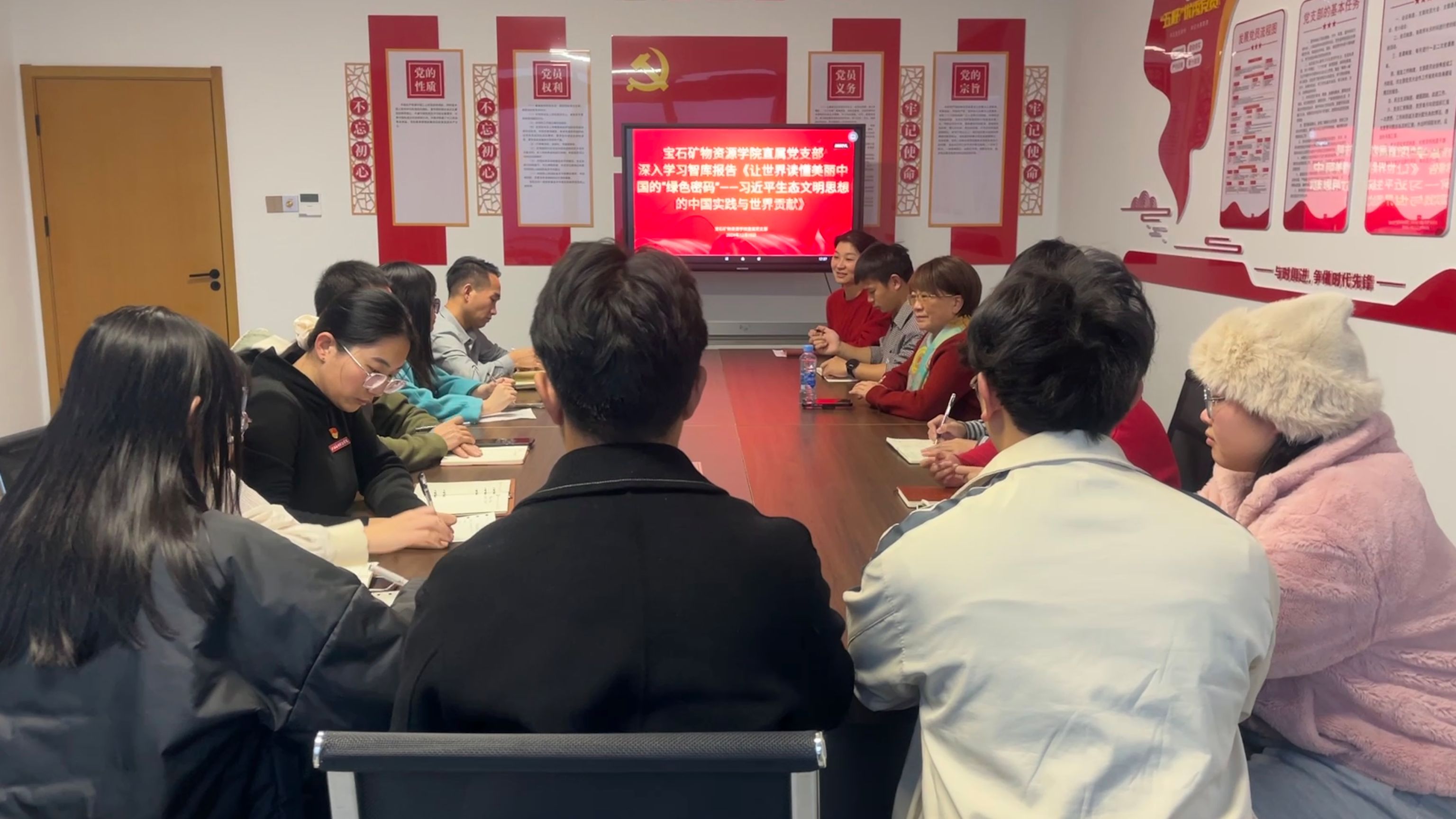12月10日,宝石矿物资源学院直属党支部在三元大厦学院8楼党员活动室开展深入学习智库报告《让世界读懂美丽中国的“绿色密码”—习近平生态文明思想的中国实践与世界贡献》学习会议,会议由直属党支部副书记吕亮亮主持召开,直属党支部全体党员参加。