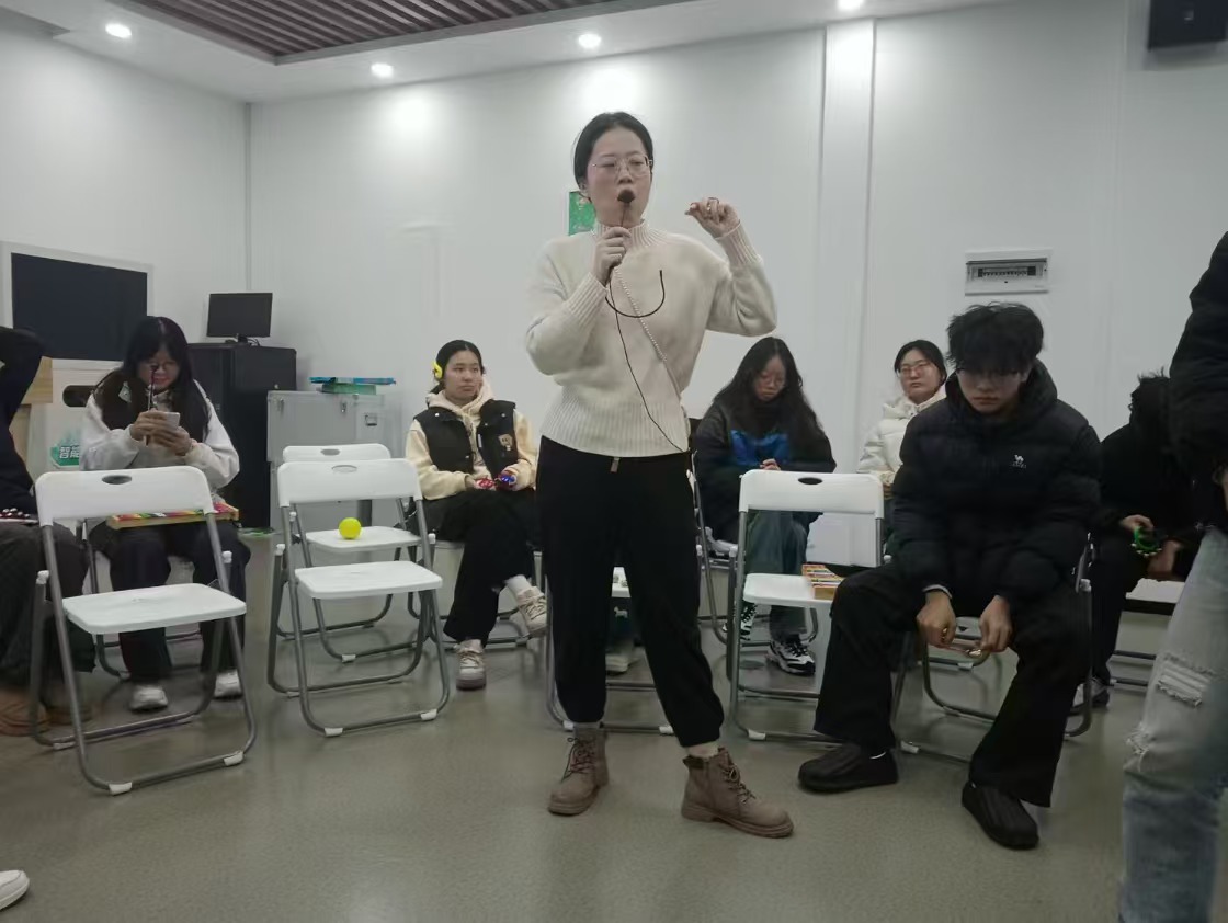 本次活动以“鼓圈”为核心,这一独特的心理实践活动以其包容性和感染力,赢得了广泛好评。在李雨珂老师的带领下,学生们手持各式手鼓、沙锤、铃铛等乐器,围坐成圈,共同沉浸在由简单而富有韵律的节奏编织而成的音乐海洋中。无论是音乐新手还是略有造诣的同学,都在这里找到了属于自己的节奏和位置,享受着音乐带来的心灵释放。