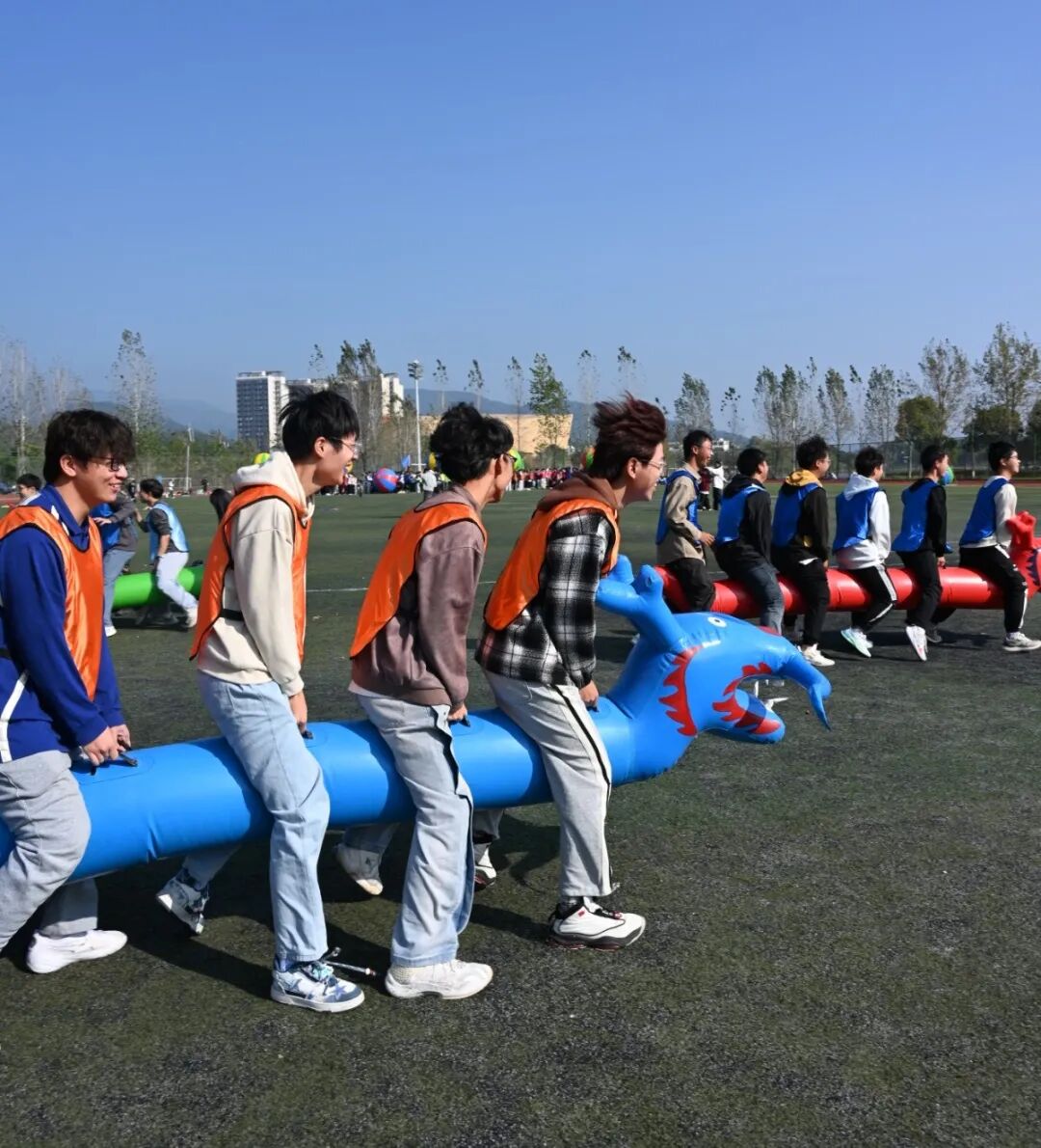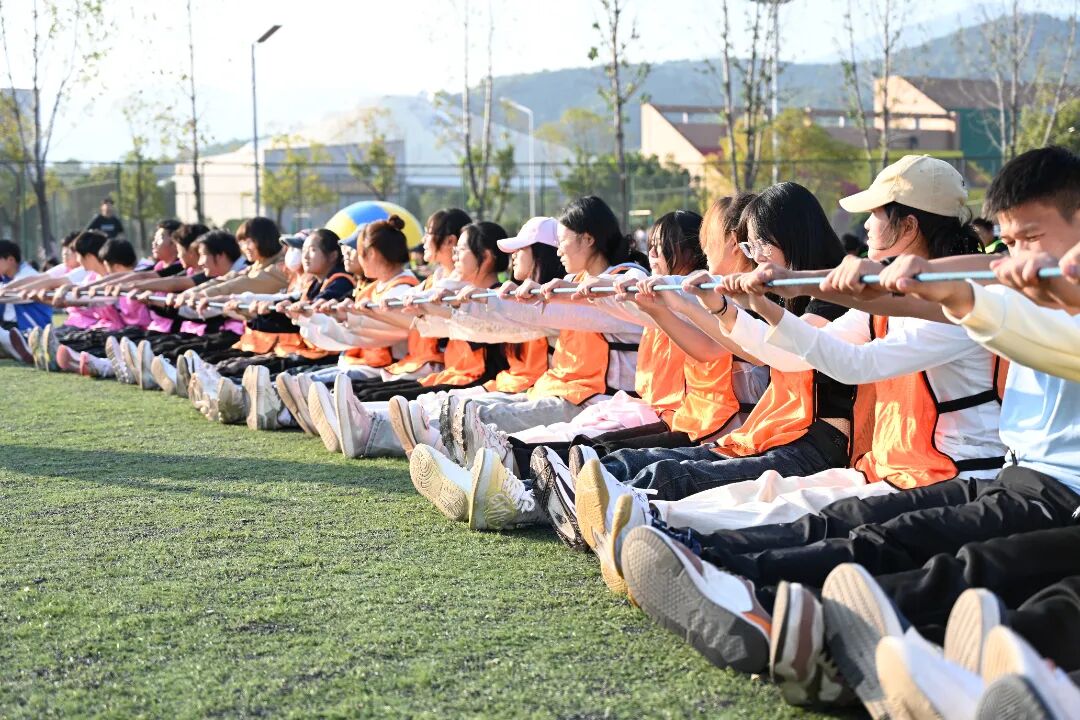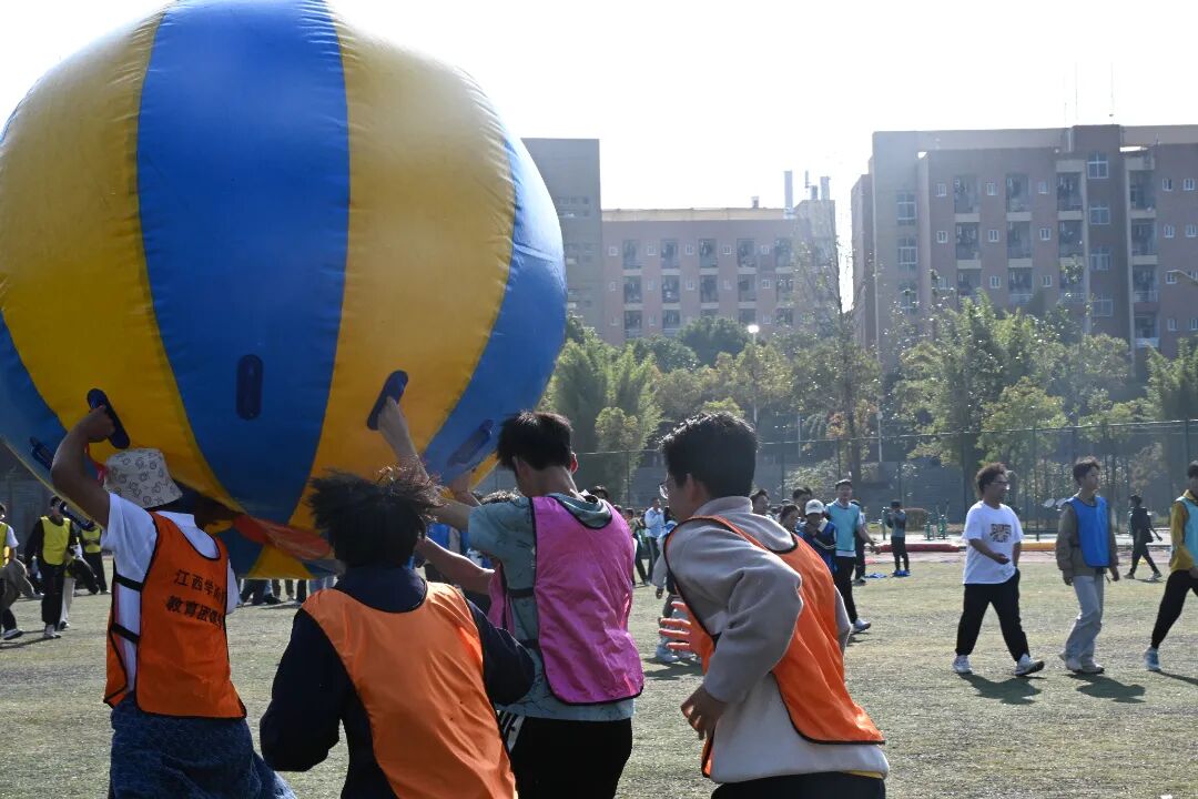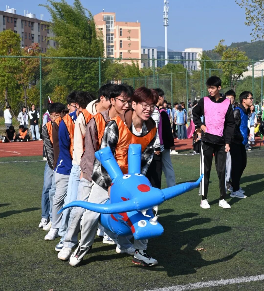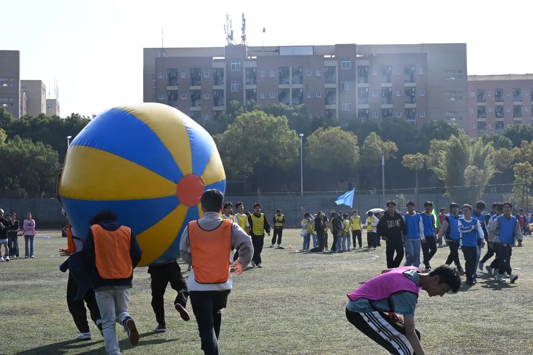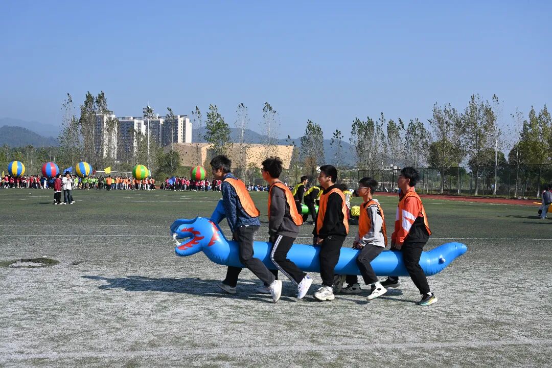 在飞盘嘉年华环节,学生们手持飞盘,在欢声笑语中尽情挥洒汗水,享受着运动的乐趣。运转乾坤项目中,学生们分组协作,通过传递和翻转大球,锻炼了团队协作和沟通能力。旱地龙舟比赛更是紧张刺激,学生们齐心协力,喊着口号,奋力向前,展现了团队合作的力量。