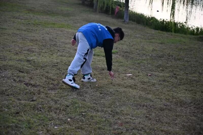 在活动现场,经过负责人的分工协调下,队员们身穿蓝色小马甲开始在沿湖进行垃圾清理。队员们相互协作认真清理河岸边的各种垃圾,烟头、纸片、水瓶等被清理一空。