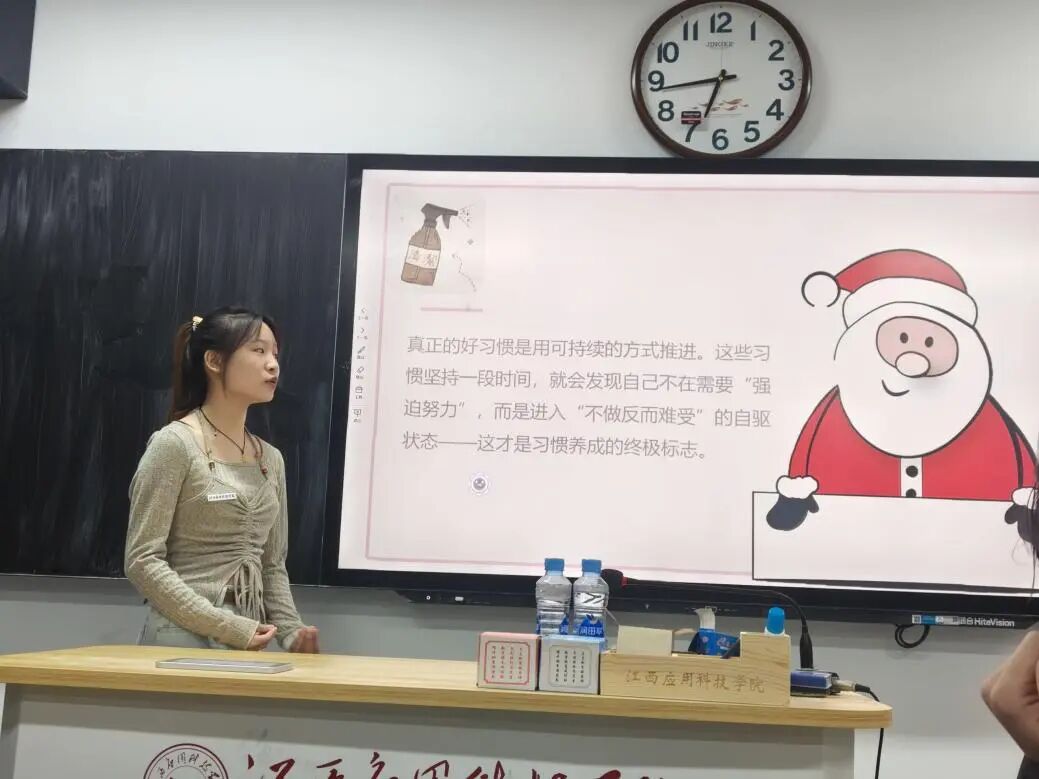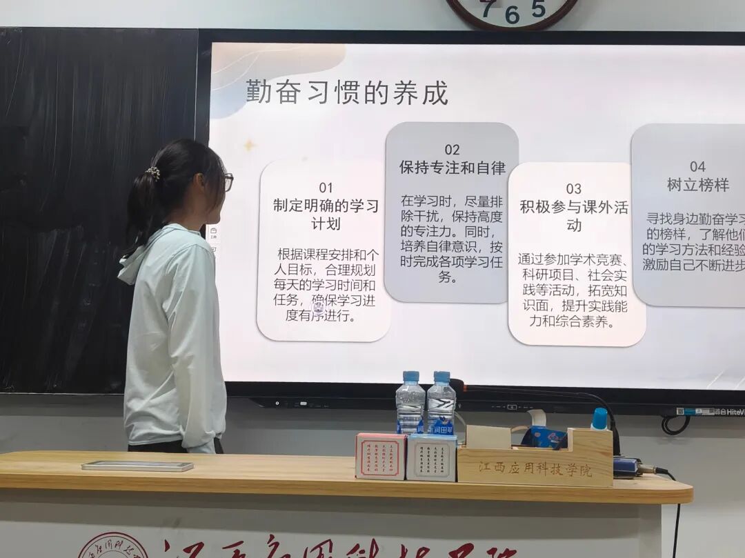 24本宝石及材料工艺学2班的李妍同学则从习惯养成的方法论角度,详细阐释了其制定的“勤奋”习惯培养计划。该计划涵盖睡前知识积累、事务高效执行、宿舍生活环境维护等具体实践内容,形成了系统化的习惯养成体系。她在分享中提出,优良习惯的终极形态是从“刻意践行”到“自然自觉”的升华,强调通过长期自我规范,使勤奋成为“不做反而难受”的行为本能,最终实现个人素养的全面提升。