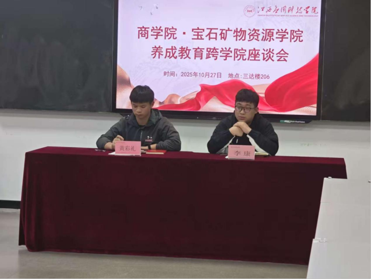 为进一步推动大学生素质养成教育工作,加强学院之间的交流与互鉴,商学院联合宝石矿物资源学院于2025年10月27日18:00于三达楼206教室举办跨学院交流分享会。会议由欧鑫兰同学主持,参加会议的人员有商学院团总支副书记李康,宝石矿物资源学院养成教育负责老师黄彩礼以及两院全体新生班级负责人。