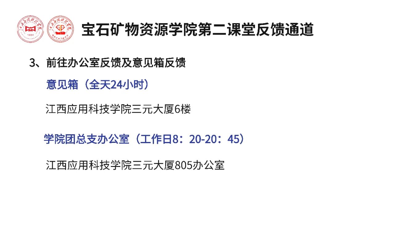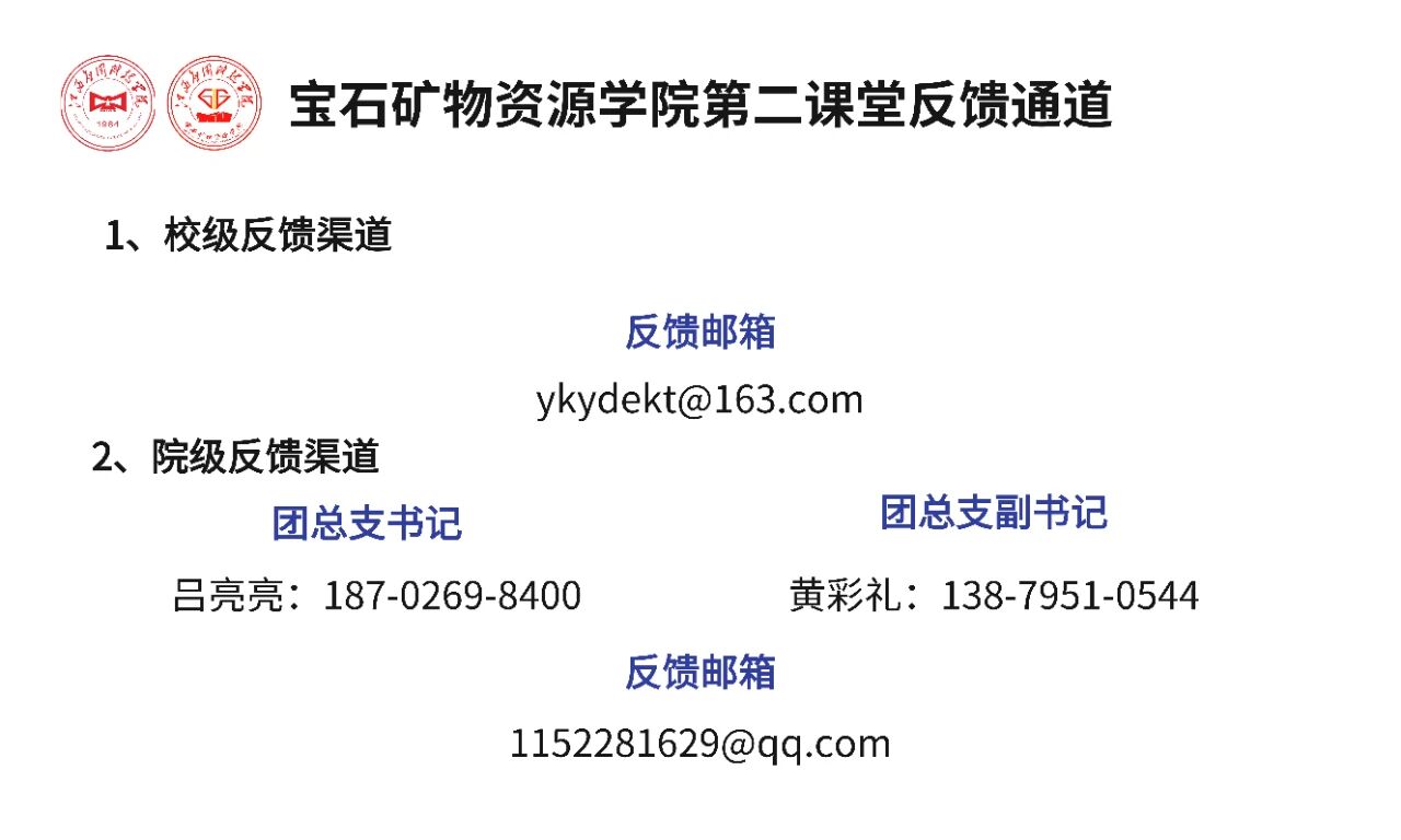 为了更好地倾听同学声音,持续改进和完善第二课堂的活动内容与管理机制,推进宝石矿物资源学院“第二课堂活动工程”建设,宝石矿物资源学院特开通第二课堂反馈通道,欢迎师生们积极建言献策,共同营造一个更加美好的学习交流氛围。
