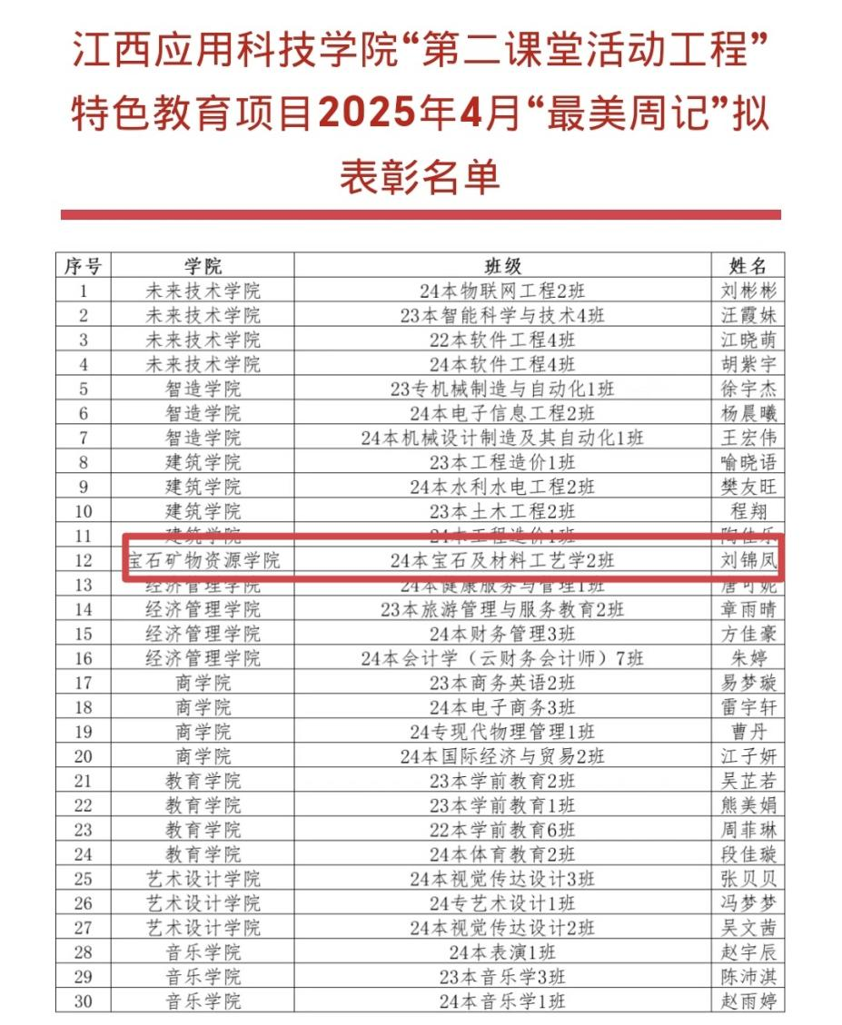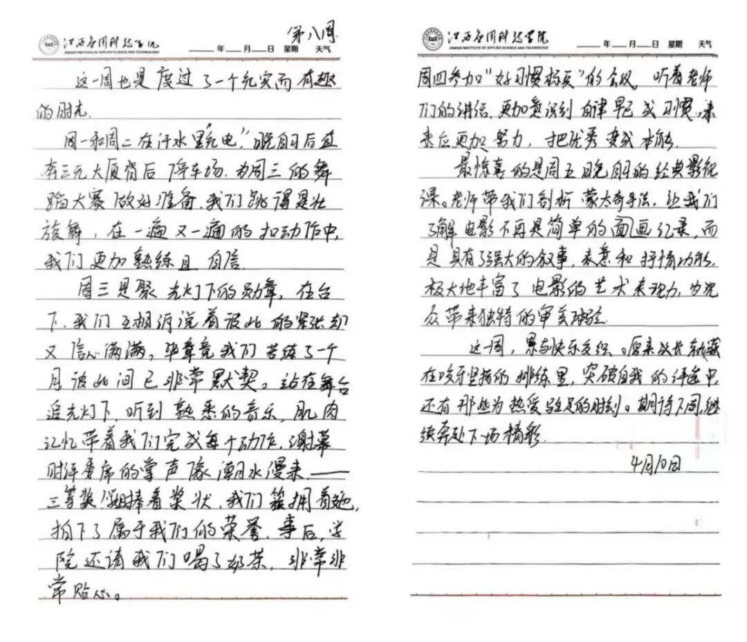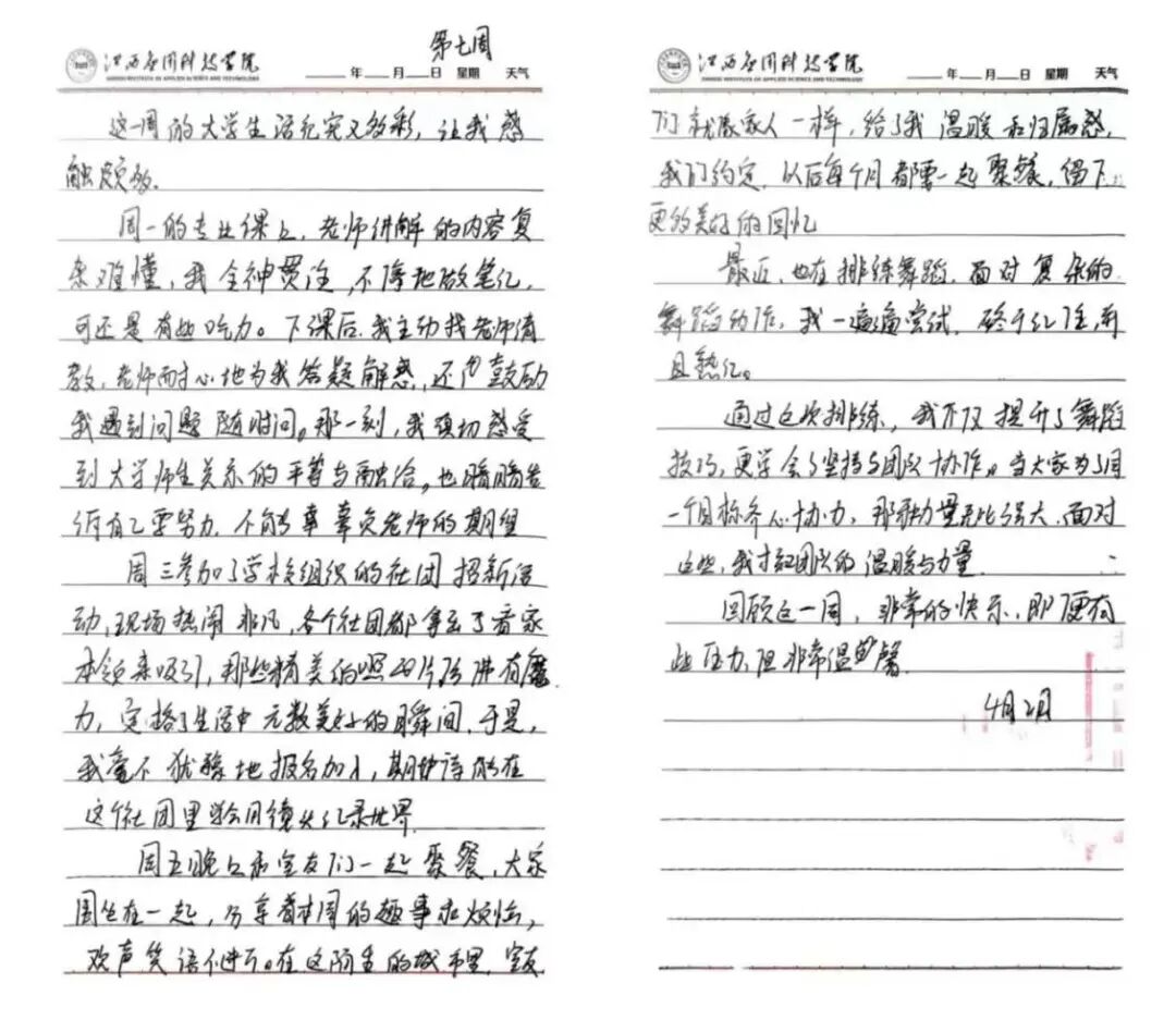 在笔尖与纸页的触碰中,周记是时光的琥珀,封存着青春的温度;是心灵的棱镜,折射出成长的光谱。“最美周记”评选不仅是对文字的奖赏,更是对生活观察者的致敬——那些认真记录日常的笔触,终将在岁月中沉淀为照亮他人的星光。我院2025年4月“第二课堂活动工程”特色教育项目“最美周记”获奖人员以不同的视角书写世界,让我们看见:每一份真诚的记录,都是榜样力量的起点。