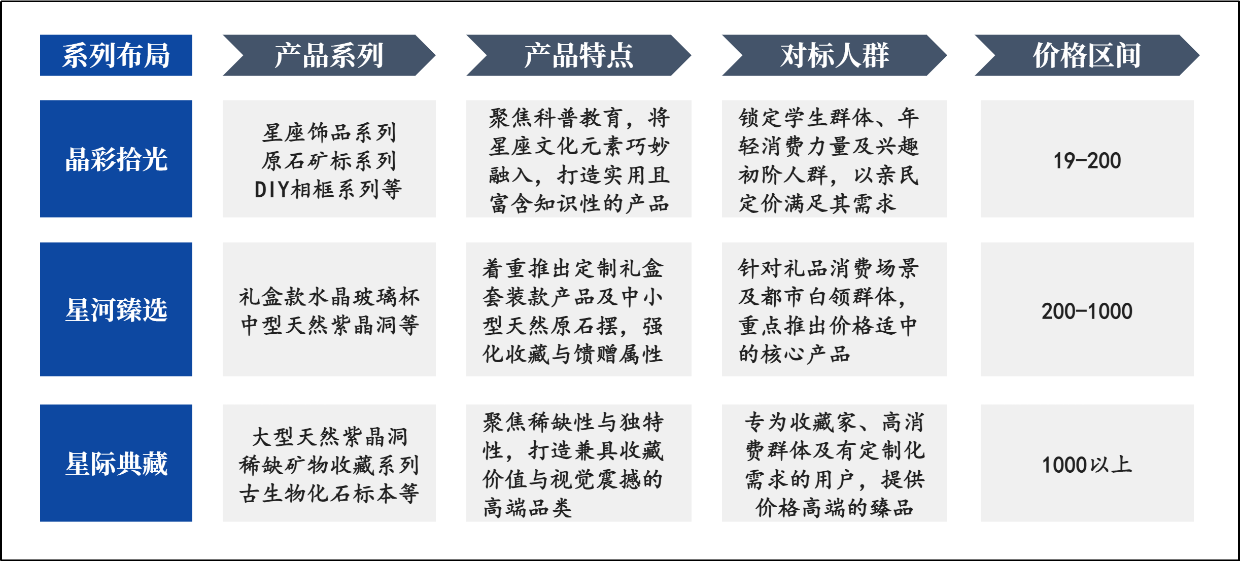 综合考虑我们选择了璀璨入门系列中9种产品作为我们的系列产品。材质上我们选用的是常见的天然宝石绿松石、水晶、东陵石等矿物;款式上主要以饰品和精美摆件为主,产品价格亲民便于销售。