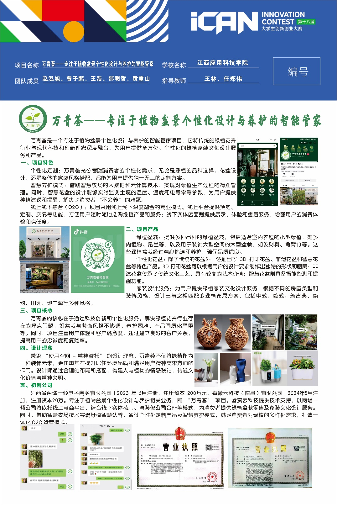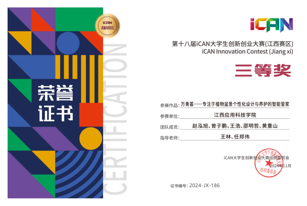 创新创业学院参赛队伍项目“万青荟——专注于植物盆景个性化设计与养护的智能管家”在激烈的竞争中脱颖而出,荣获江西赛区三等奖。这一成就不仅是对团队创新理念和设计能力的认可,更彰显了应科学子在创新创业教育方面的努力与成就。同时,我校还获得了“优秀组织单位”的称号,以及“优秀指导老师”奖项。希望在未来再创辉煌!!!