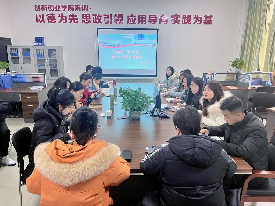 2024年2月26日下午,创新创业学院全体教师例会暨2023~2024学年第二学期第一次开学筹备会议在产教融合中心213办公室召开,创新创业学院院长张荆及全体行政干部、教职工参会,会议由副院长何梦杨主持。