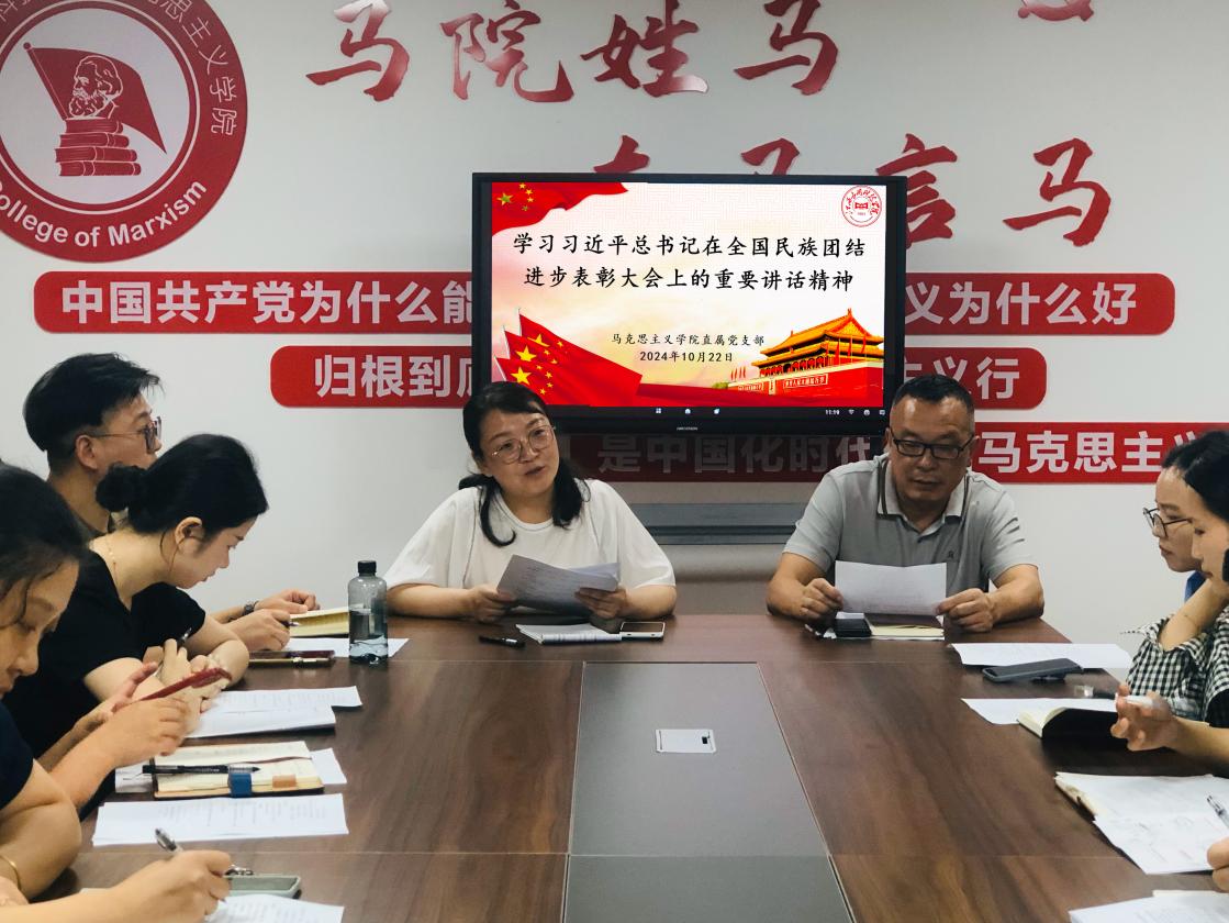 10月22日,马克思主义学院直属党支部在综合楼807会议室开展学习贯彻习近平总书记在全国民族团结进步表彰大会上的重要讲话精神。会议由马克思主义学院直属党支部书记于冰雁主持,马院全体教师参加。