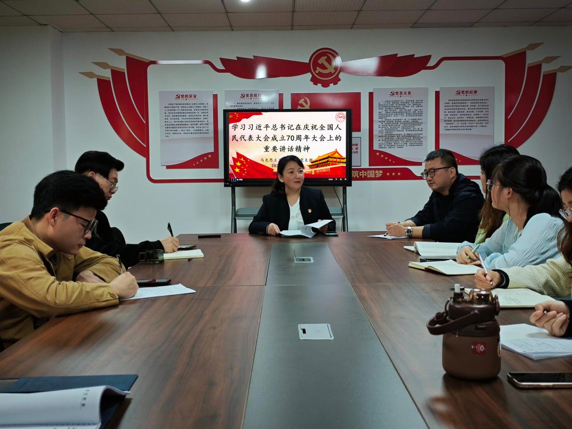 会议开始,由党支部书记于冰雁带领全体党员深入学习习近平总书记在庆祝全国人民代表大会成立70周年大会上的重要讲话精神。她指出,人民代表大会制度是中国人民民主专政的政权组织形式,是中国的根本政治制度,人民代表大会制度不断发展完善、更加成熟定型,已经牢牢扎根中国大地,深深融入中国特色社会主义伟大实践。