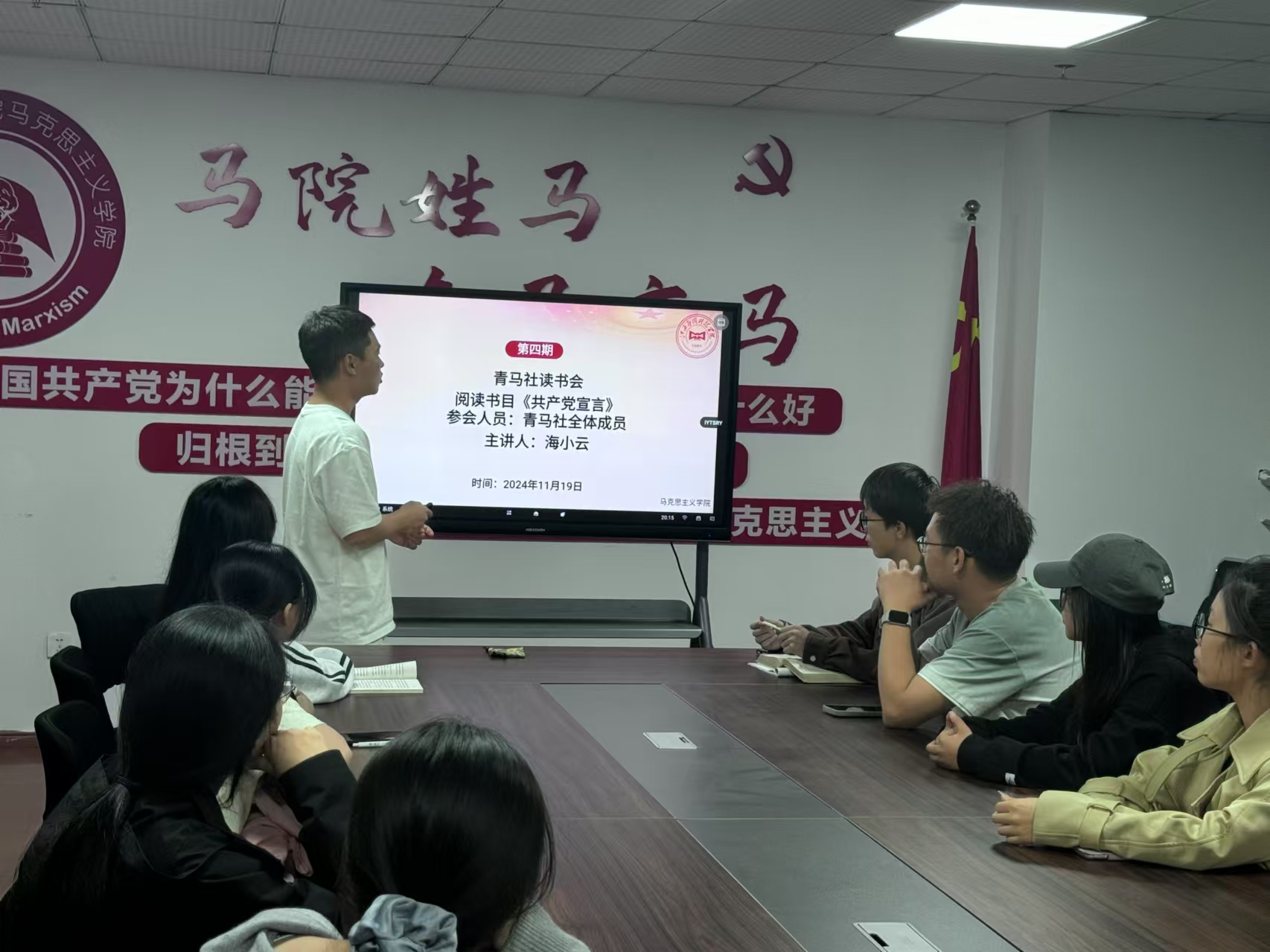 为深入理解马克思主义,进一步提升理论素养和思想觉悟,贯彻落实学好、用好马克思主义,2024年11月19日19:00—21:00,江西应用科技学院青马读书社于综合楼807会议室举办了读书会,主题聚焦于《共产党宣言》中的“无产者和共产党人”部分。此次活动由马克思主义学院海小云老师担任领读人,青马读书社全体成员共同参与。