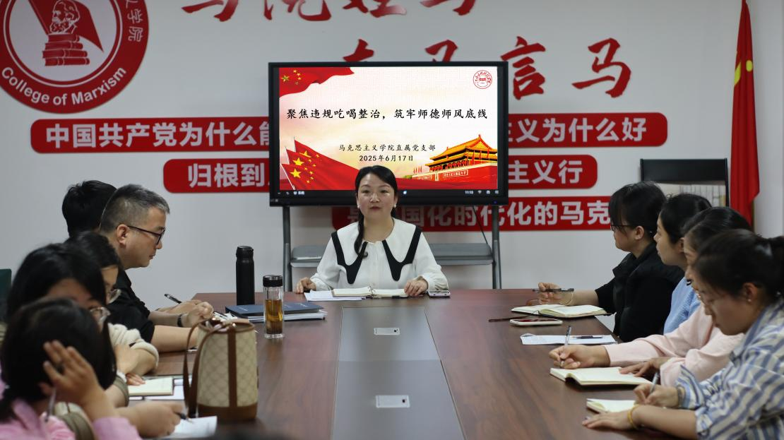 6月17日,马克思主义学院直属党支部在综合楼807会议室,围绕《关于集中整改违规吃喝的通知》开展理论学习。会议由马克思主义学院直属党支部书记于冰雁主持,马院全体教师参加。