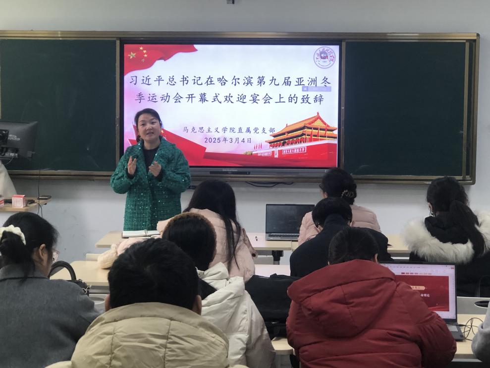 3月4日,马克思主义学院直属党支部在综合楼807围绕习近平总书记在哈尔滨第九届亚洲冬季运动会开幕式欢迎宴会上的致辞展开学习,会议由马克思主义学院直属党支部书记于冰雁主持,马院全体教师参加。